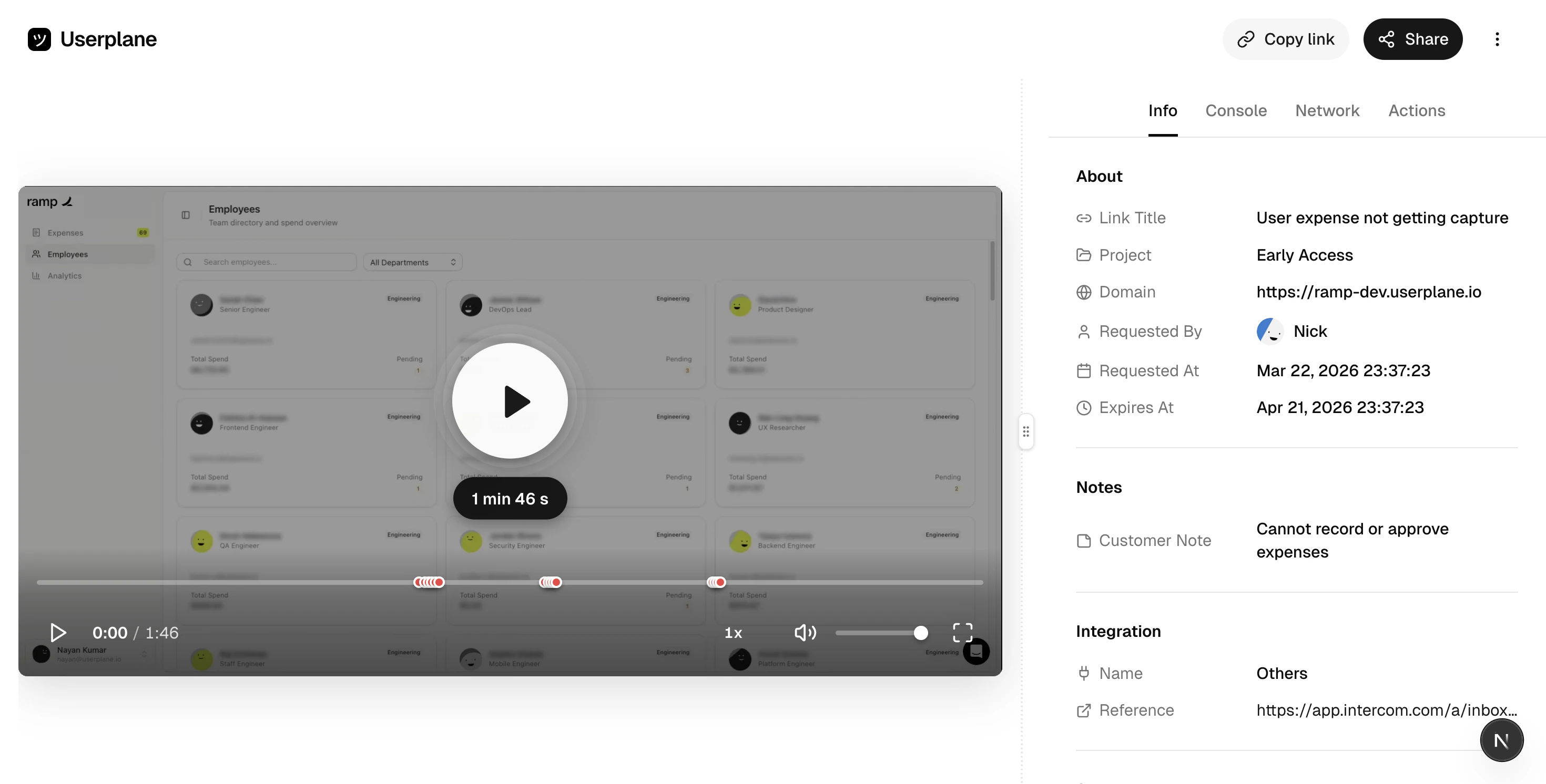 Userplane helps your support team request screen recordings from customers in seconds. Instead of asking customers to describe what went wrong, send them a simple link and get a full video of the issue — complete with console logs, network activity, and more.How it works
