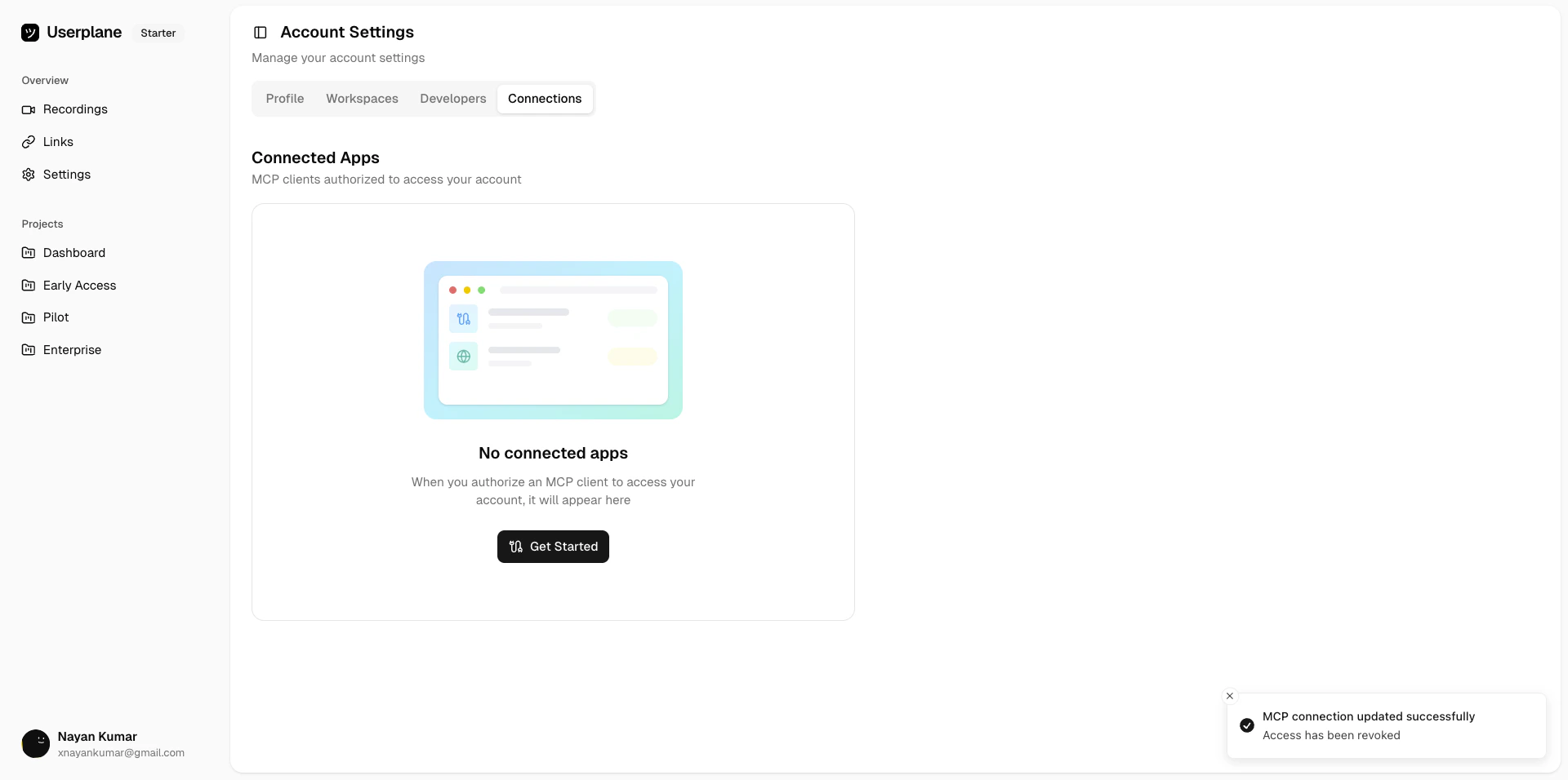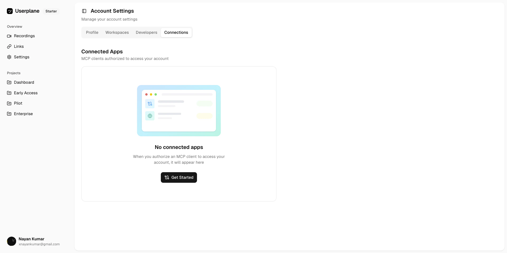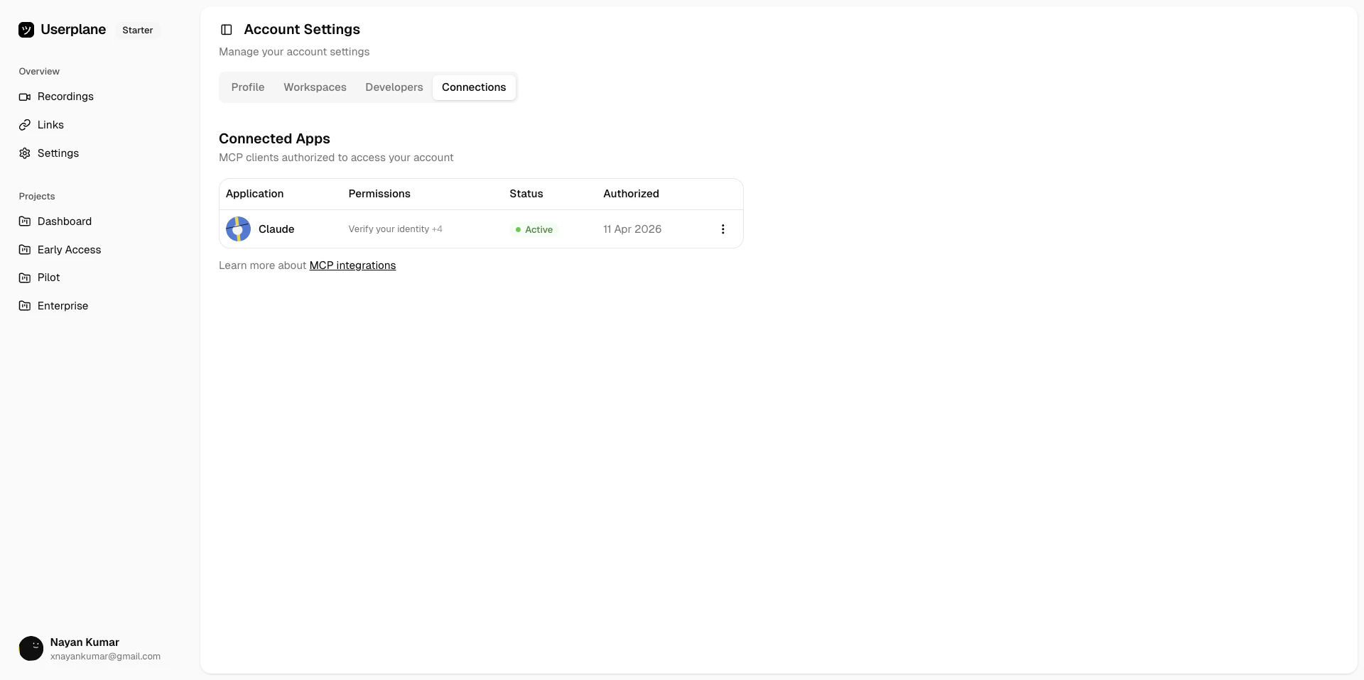 Connect Claude, Cursor, VS Code, or ChatGPT to your Userplane workspace