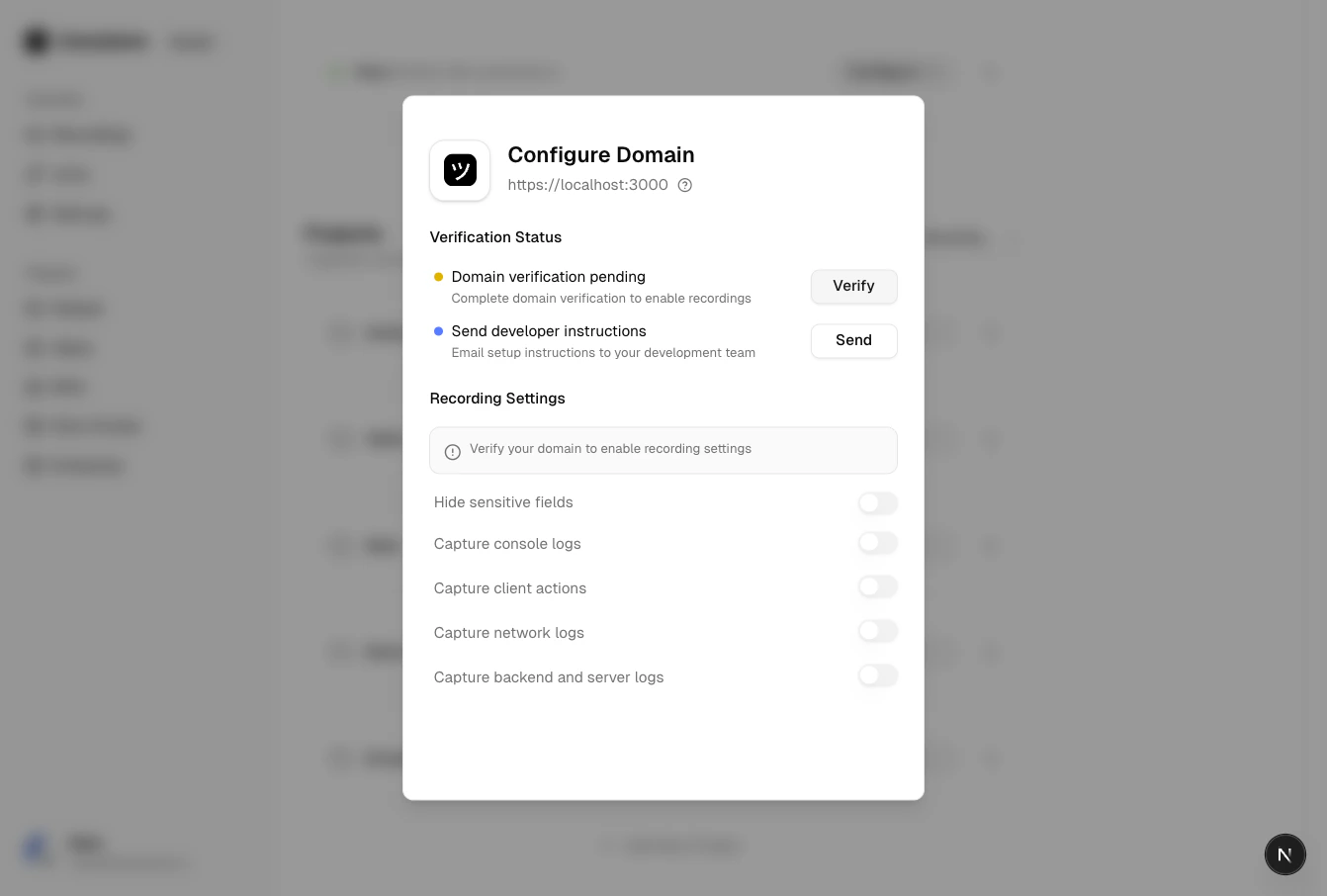Once the domain is verified, keep the script on your site — it is needed for recordings to work. The meta tag and script serve double duty: they verify the domain and enable screen recording.