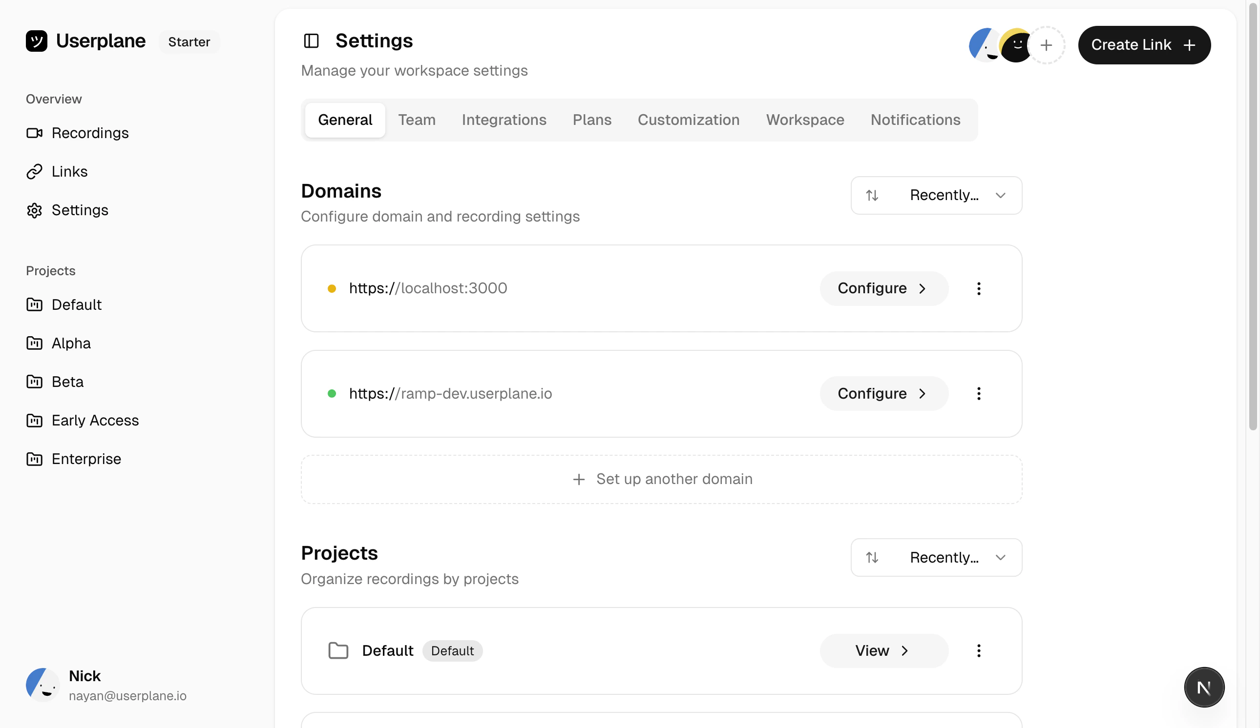 YOUR_WORKSPACE_ID with your workspace ID. You can copy the exact snippet with your ID pre-filled from Workspace Settings > Domains in the Userplane dashboard.
