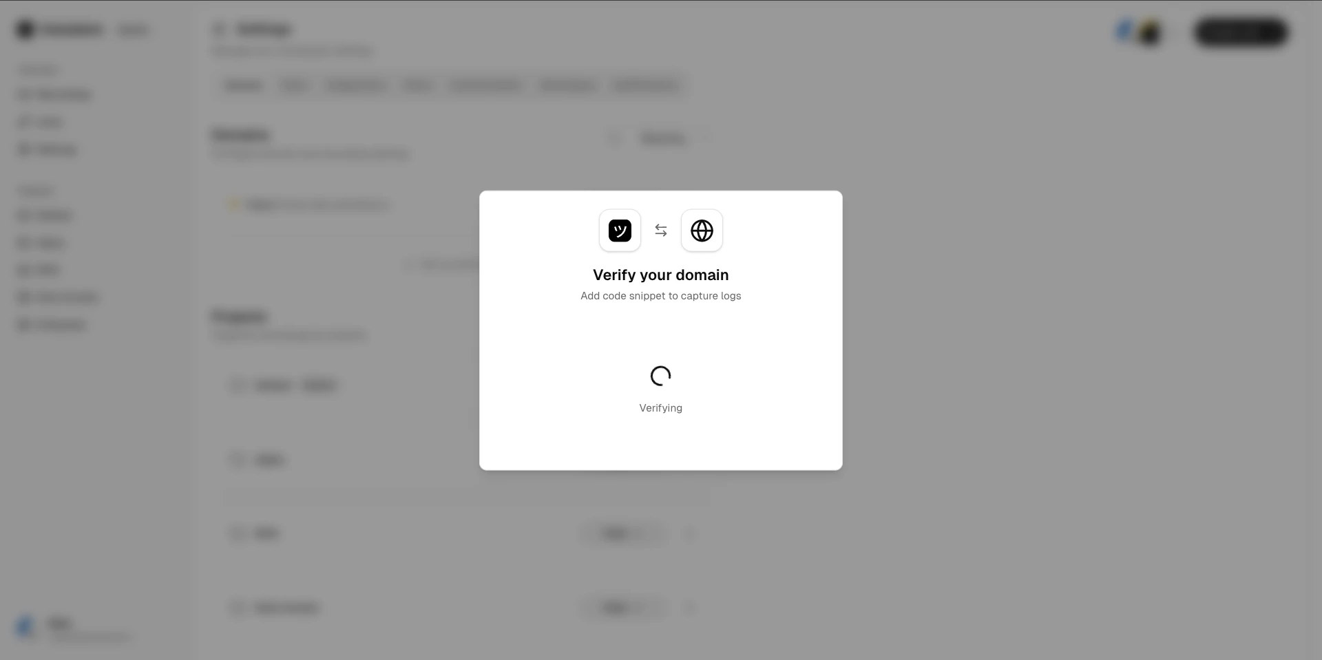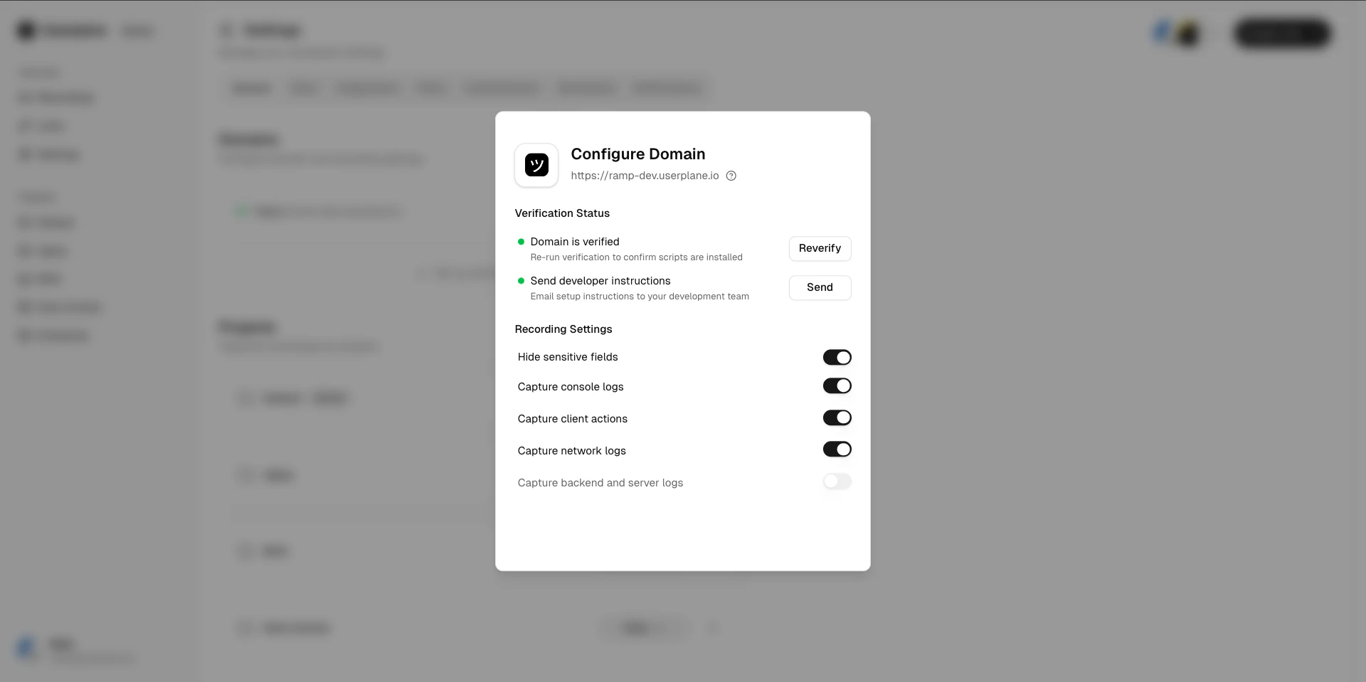 Domain verification is required before your support team can create branded recording links on your domain. Userplane verifies ownership by checking that the embed script is present on your site.Add your domain in the dashboard