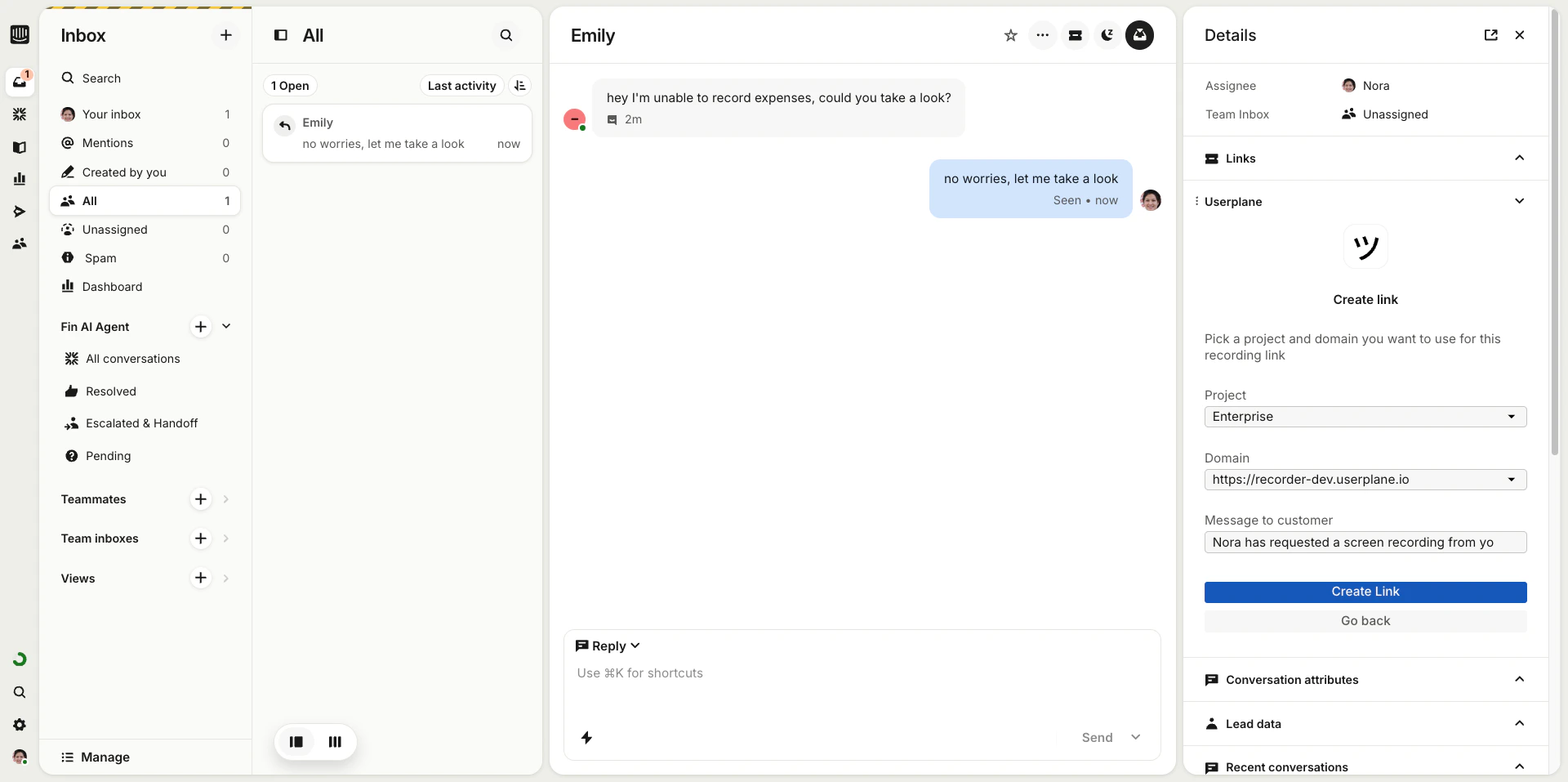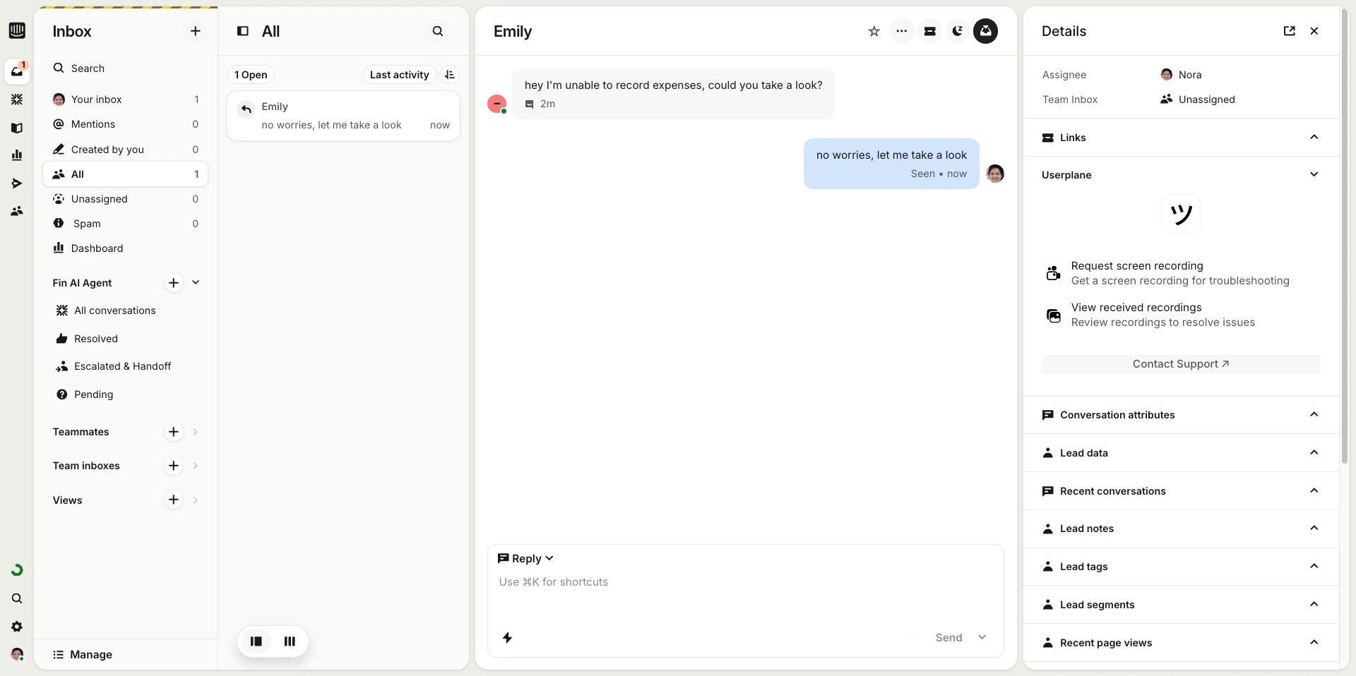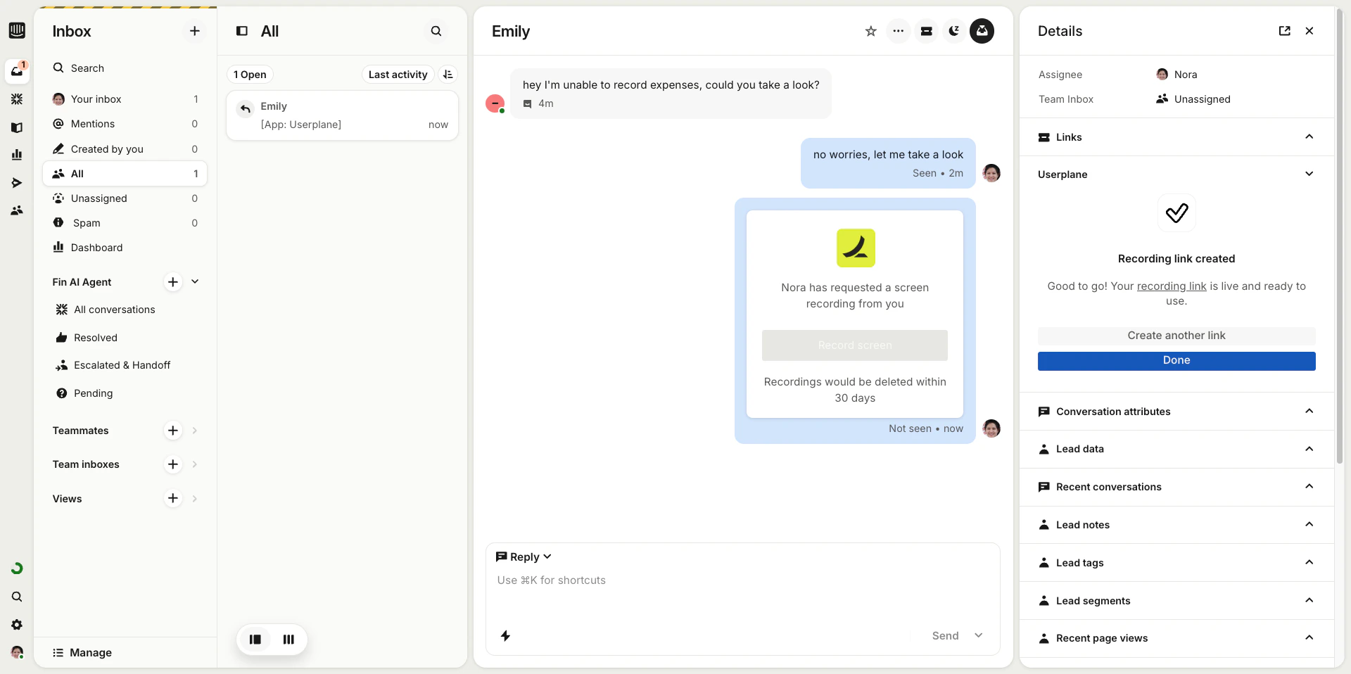 Userplane lives in your Intercom inbox as a sidebar app. To pin it: