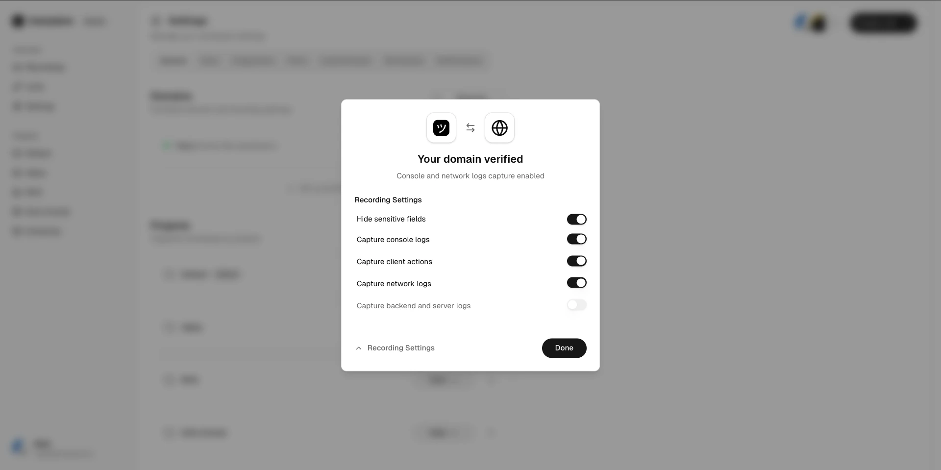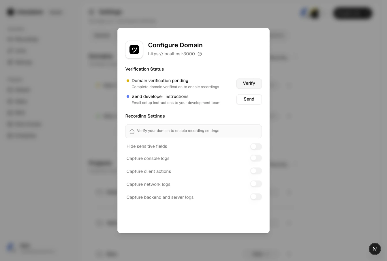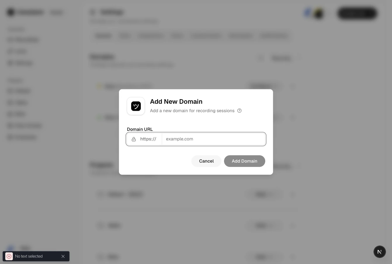 Domain verification enables first-party branded recording links — customers see your domain, not Userplane’s. Userplane verifies ownership by checking that its embed script is present on your site.Add your domain