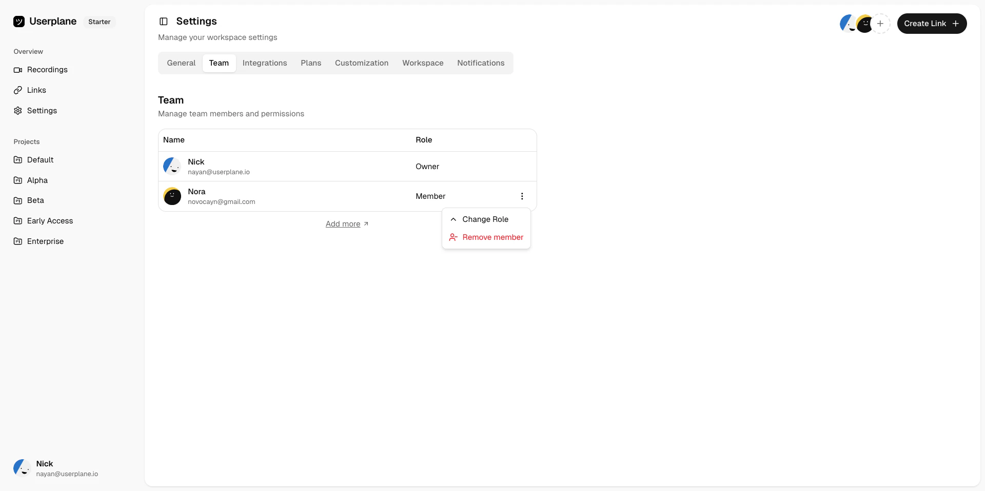 teammates. Admins can manage integrations and settings; Members can create links and review