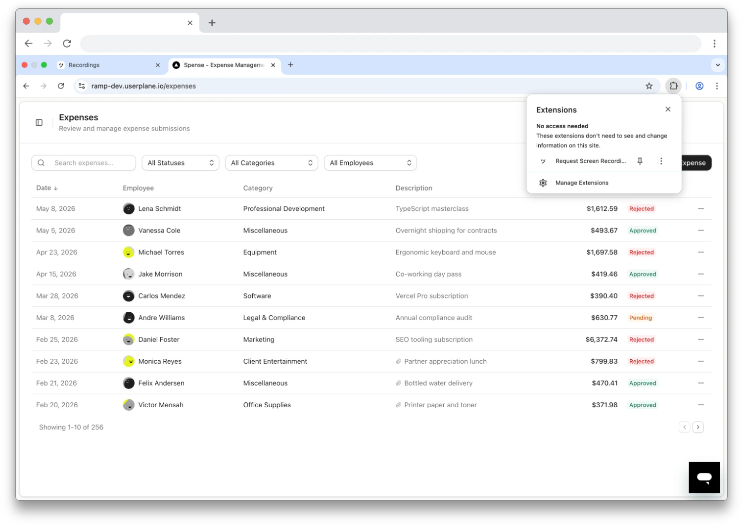 The Chrome extension is a management tool — it does not record the screen itself. Customers record