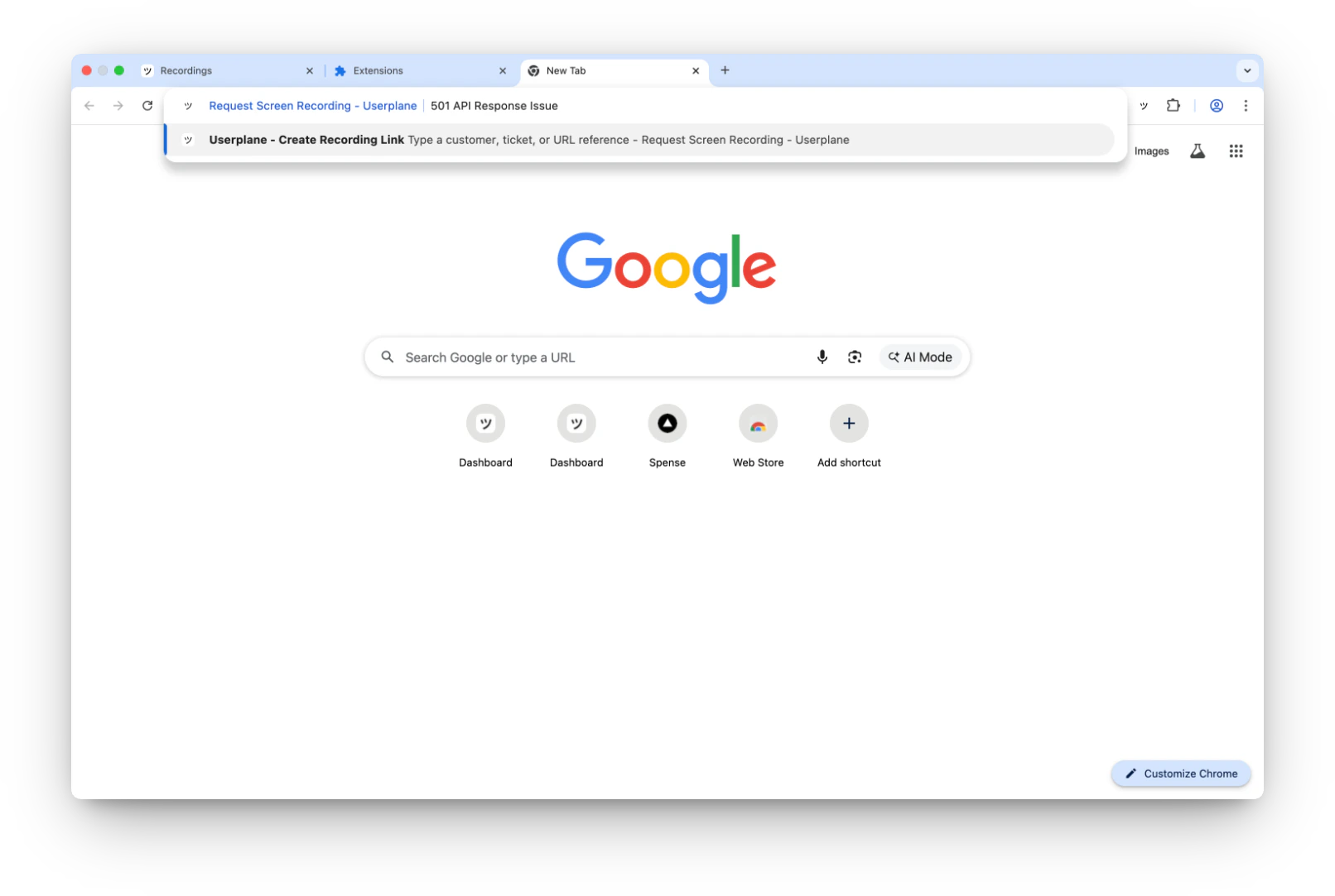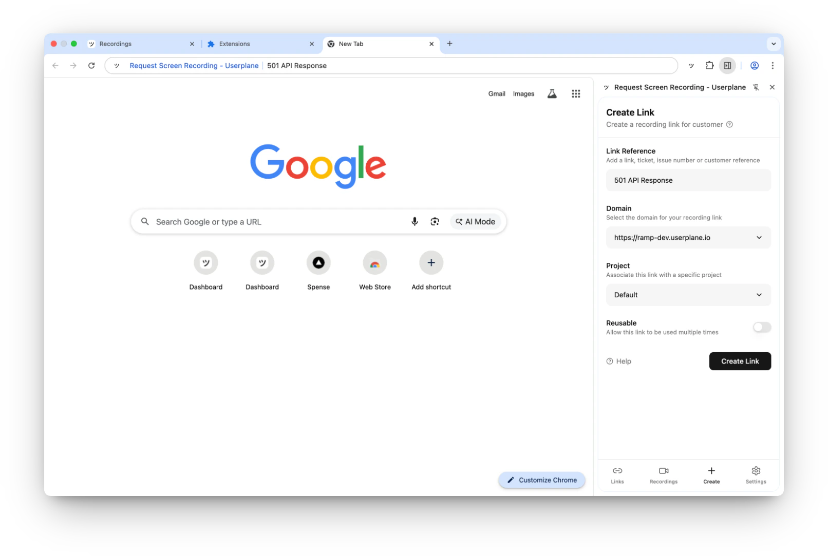 Click the Userplane icon in your Chrome toolbar. The side panel opens to the Links list.