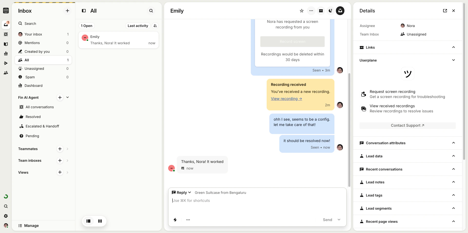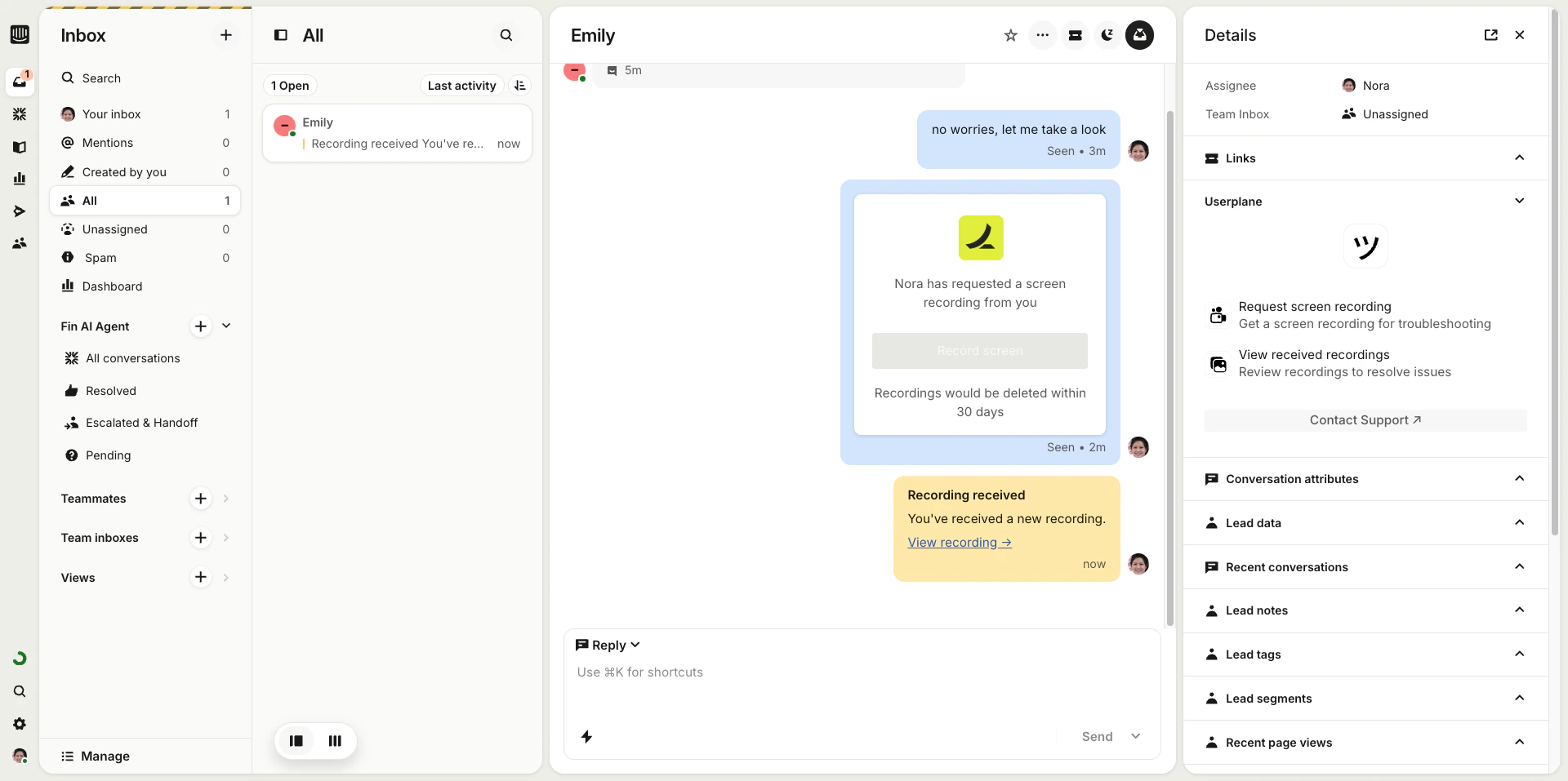 Recordings created through the macro are automatically linked to the Intercom conversation. Because the metadata is injected dynamically via placeholders, each recording carries its own conversation context — even though they all come from the same reusable link.Metadata attached