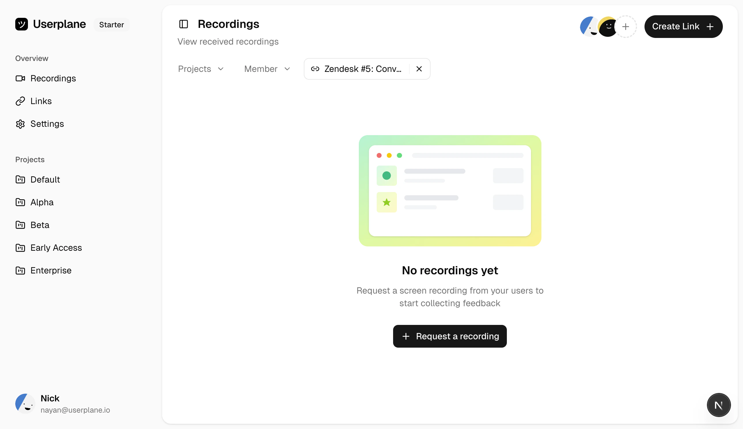 In Userplane, create a reusable recording link. Choose the appropriate project and domain, enable the Reusable toggle, then copy the link URL.
