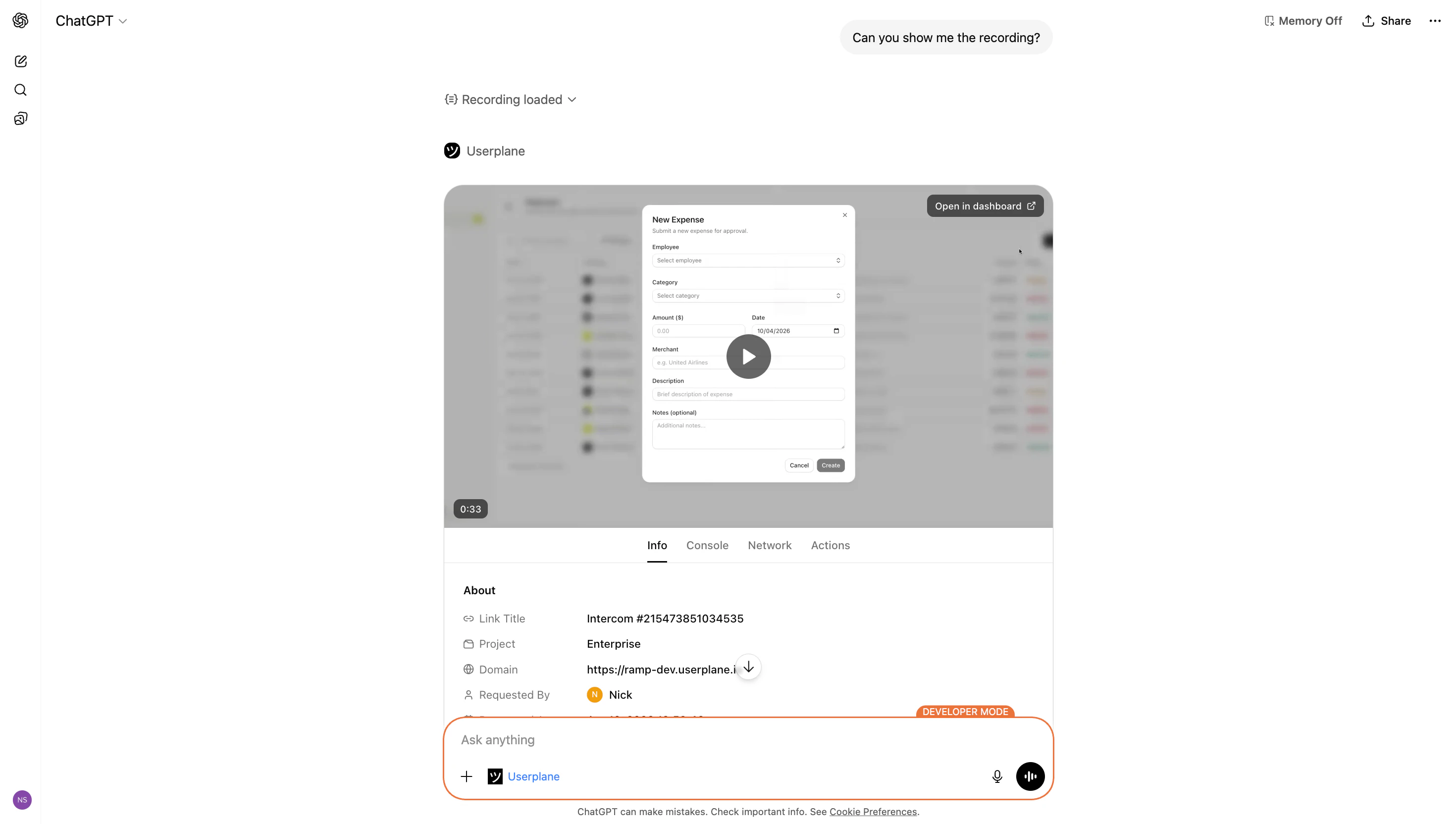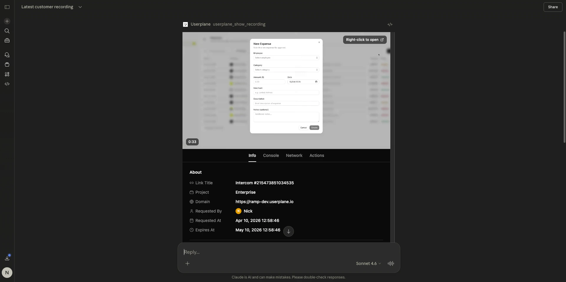 The recording viewer includes a direct link to the same recording in the Userplane dashboard. Use this to access the full playback experience with synchronized video and timeline scrubbing.Related articles