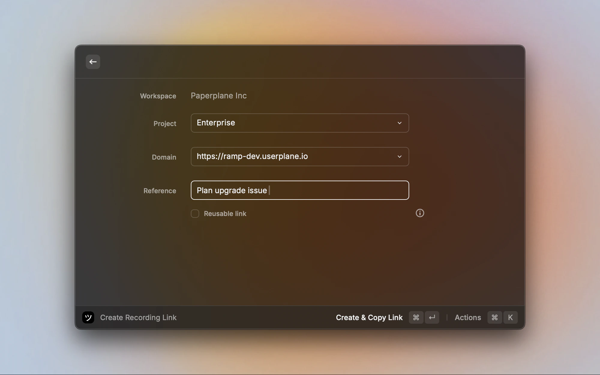 | Create Another Link | Cmd+N | Returns to the Create Recording Link form |