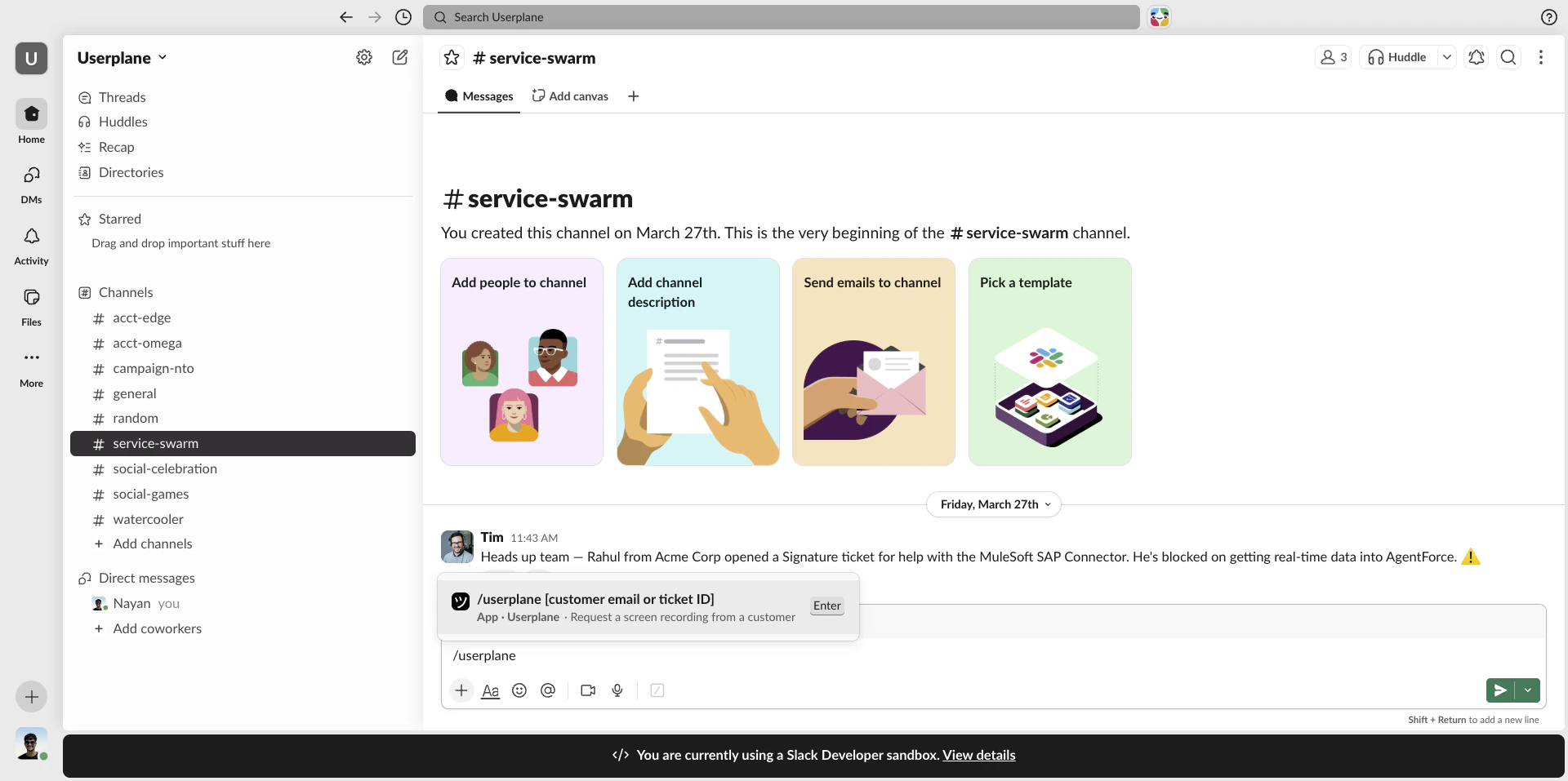 | Access | Type in any channel or DM | Right-click any message | Open the Userplane app tab |