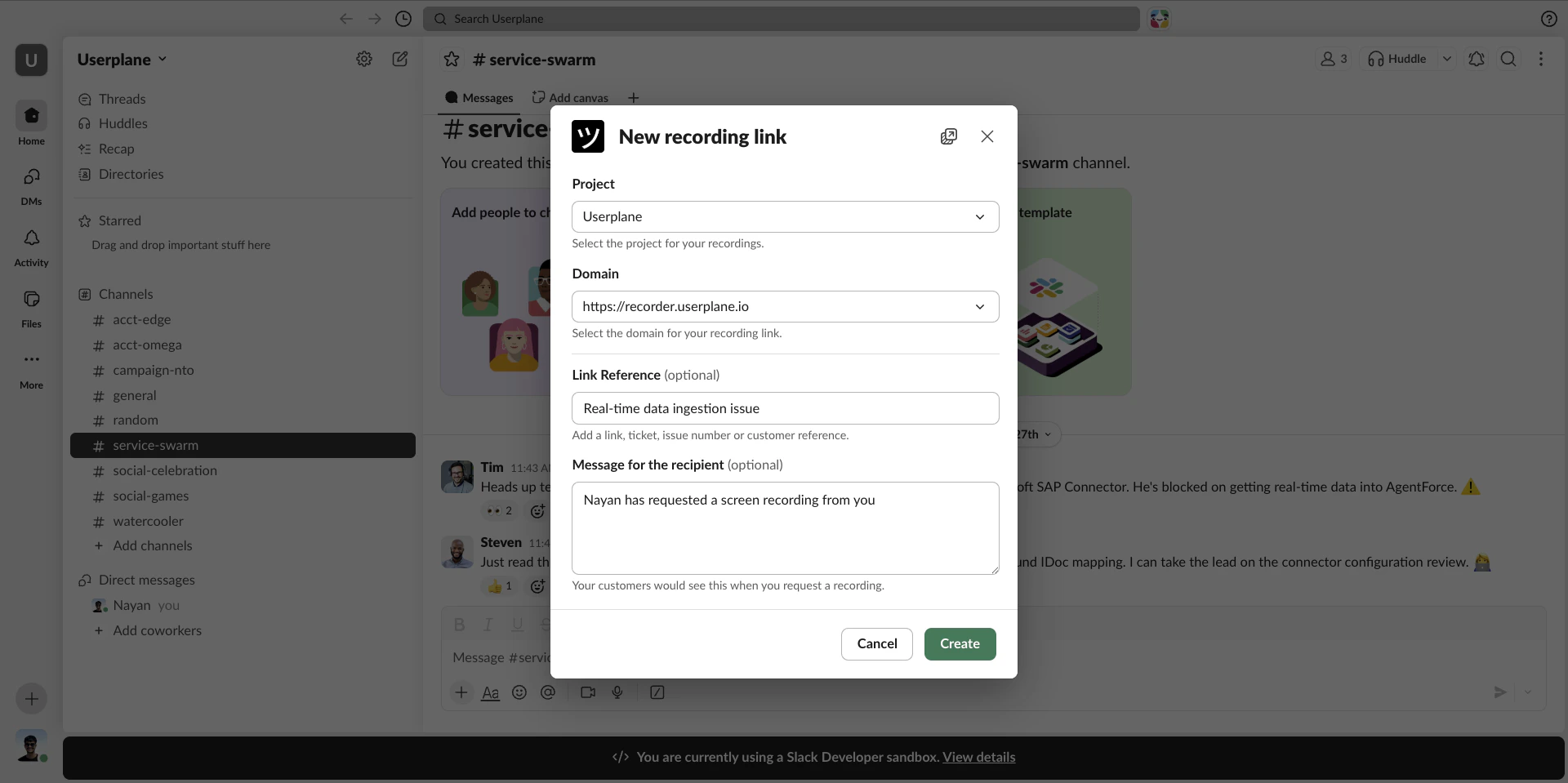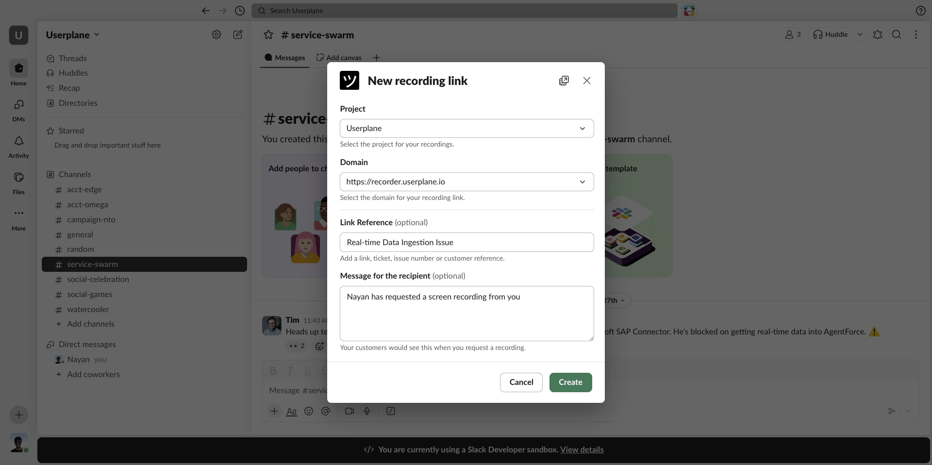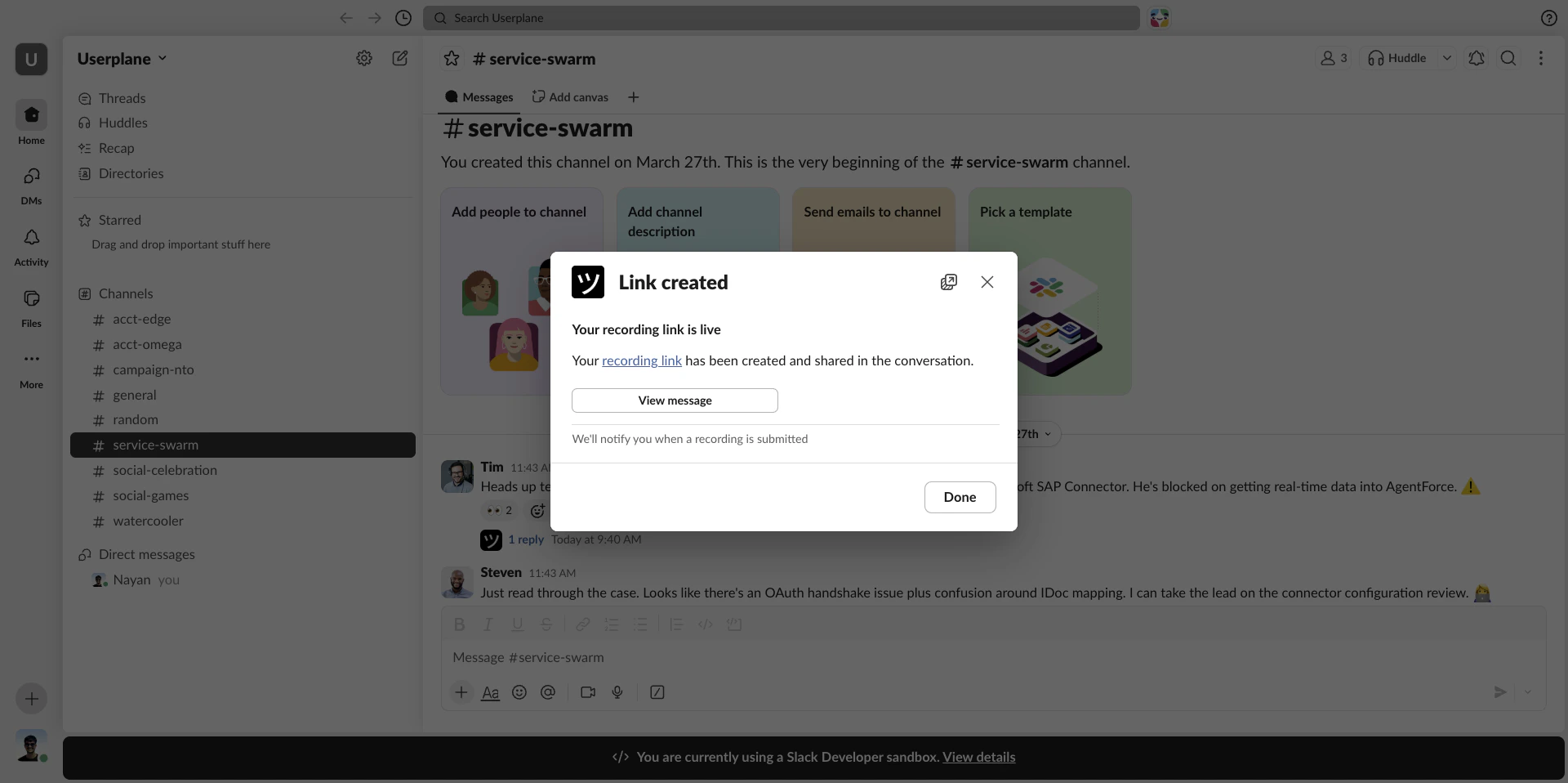 You get a DM in Slack with a View Recording button. Click it to open the recording in Userplane.