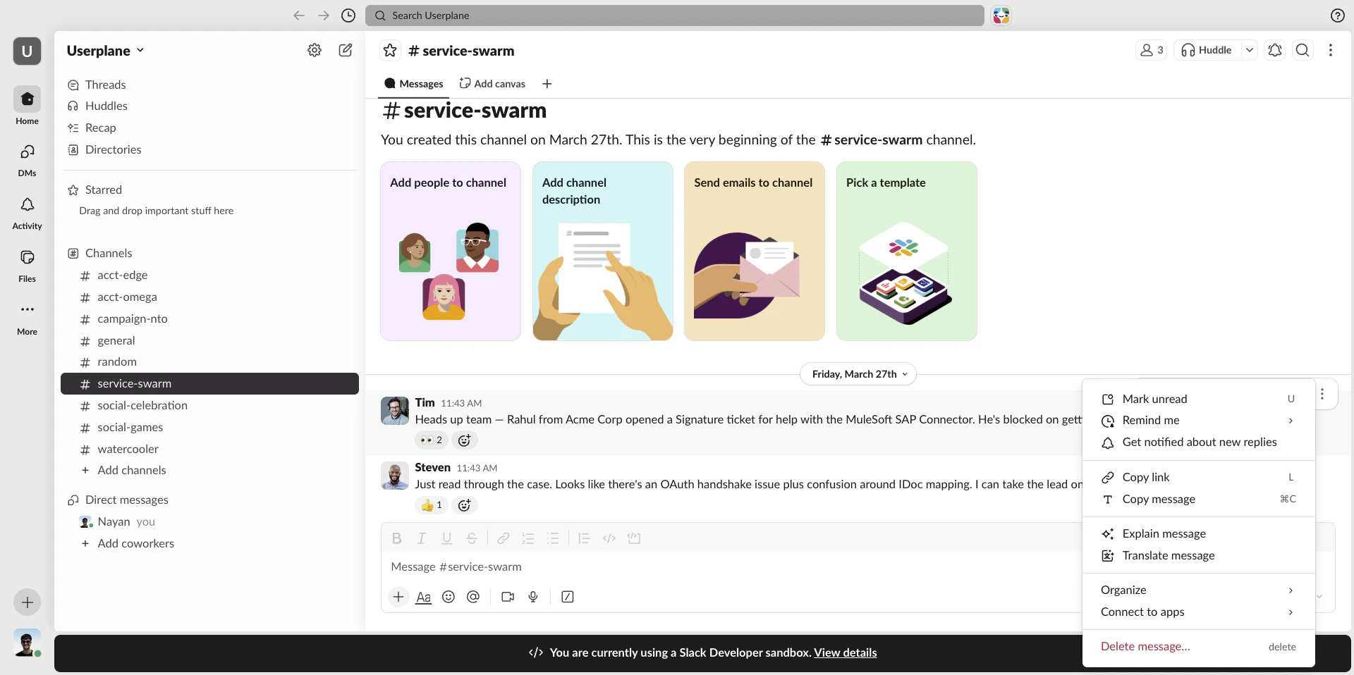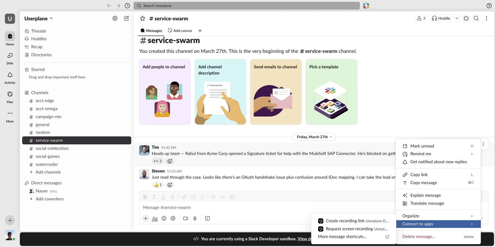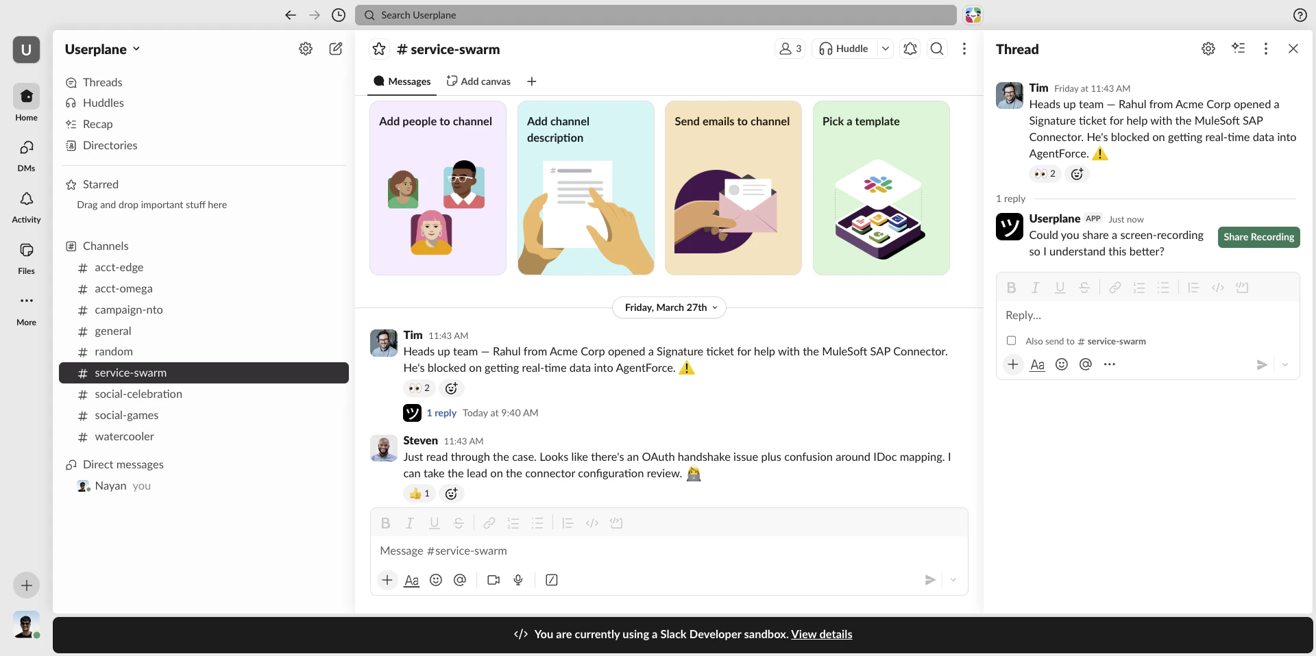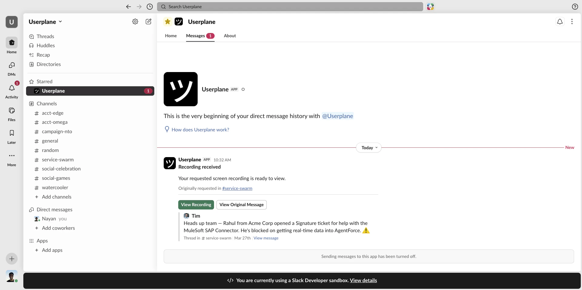 /userplane. - Slack App Home — browse and manage recording links from the Userplane tab.