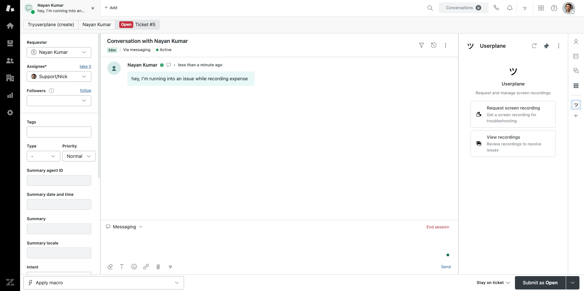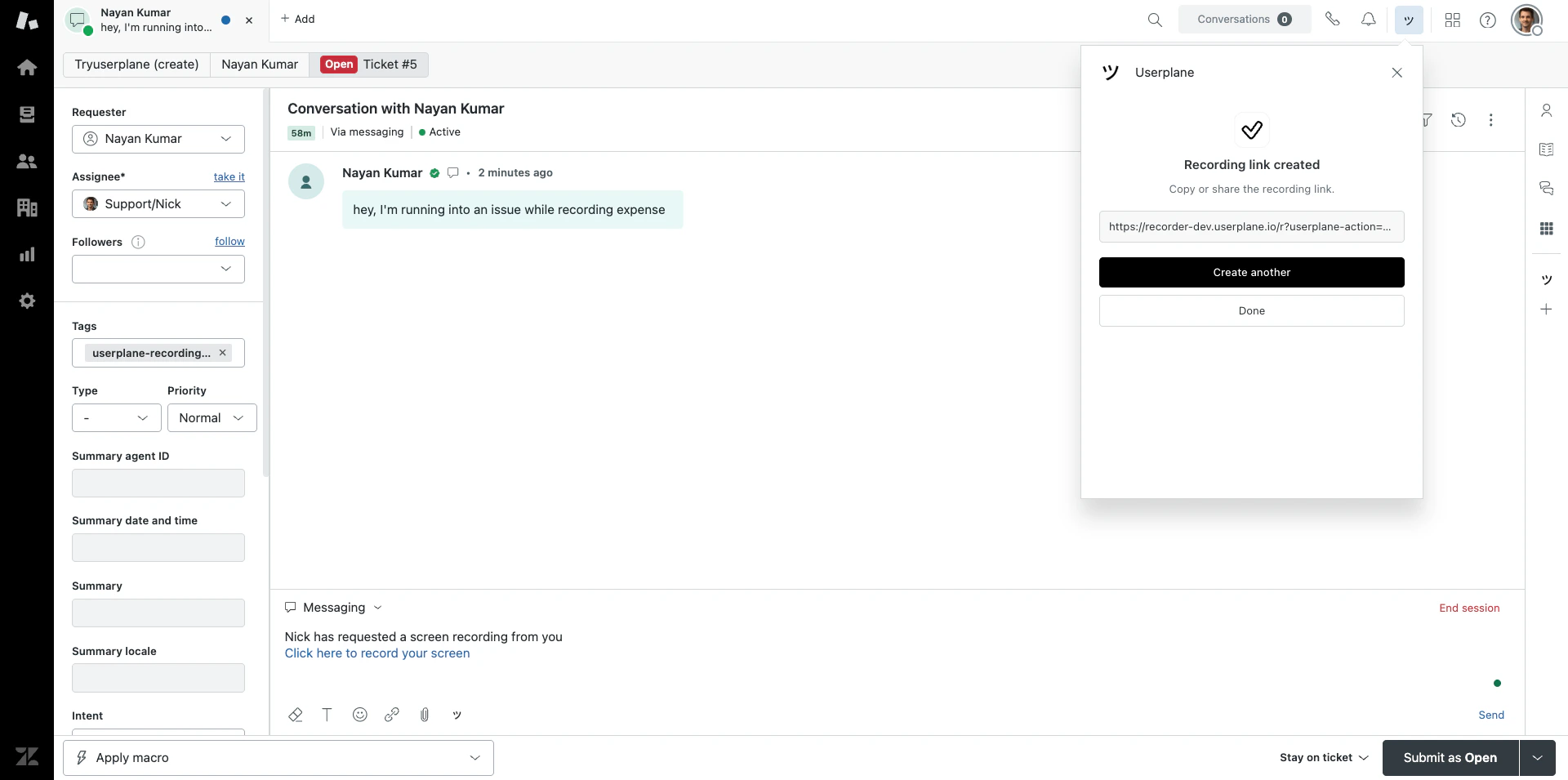 If the link was created from a ticket, Userplane posts an internal note — visible only to agents — with a direct link to the recording playback. Click the link to jump straight to the recording. See Zendesk Notifications for details.