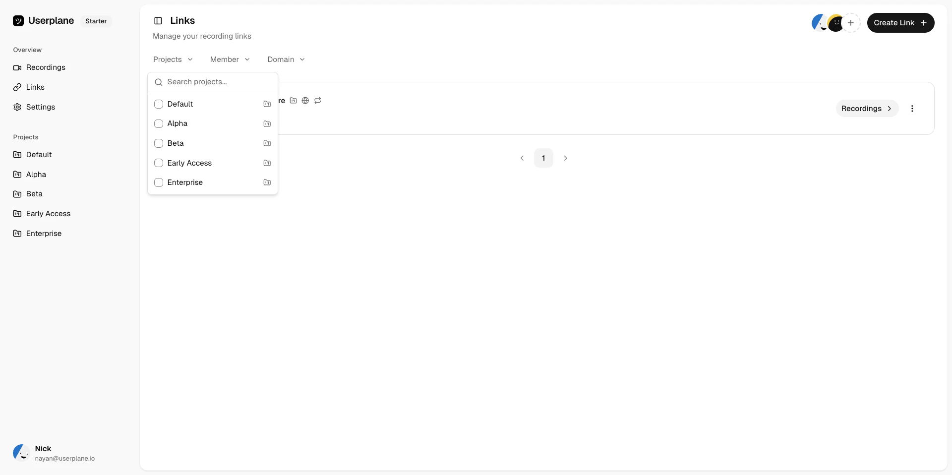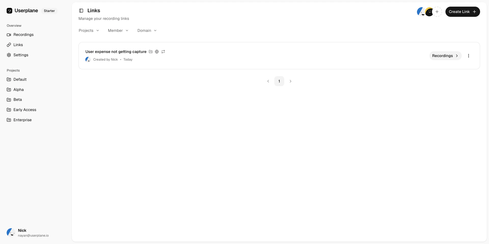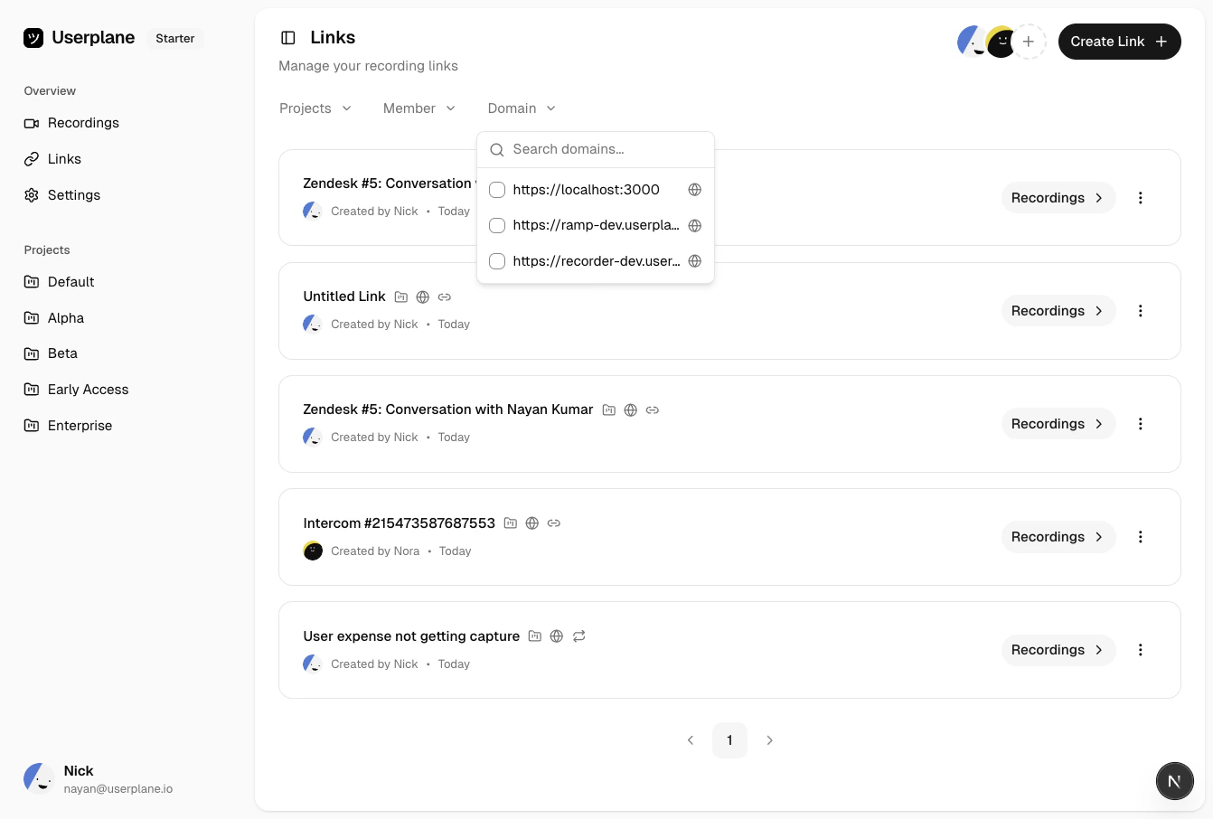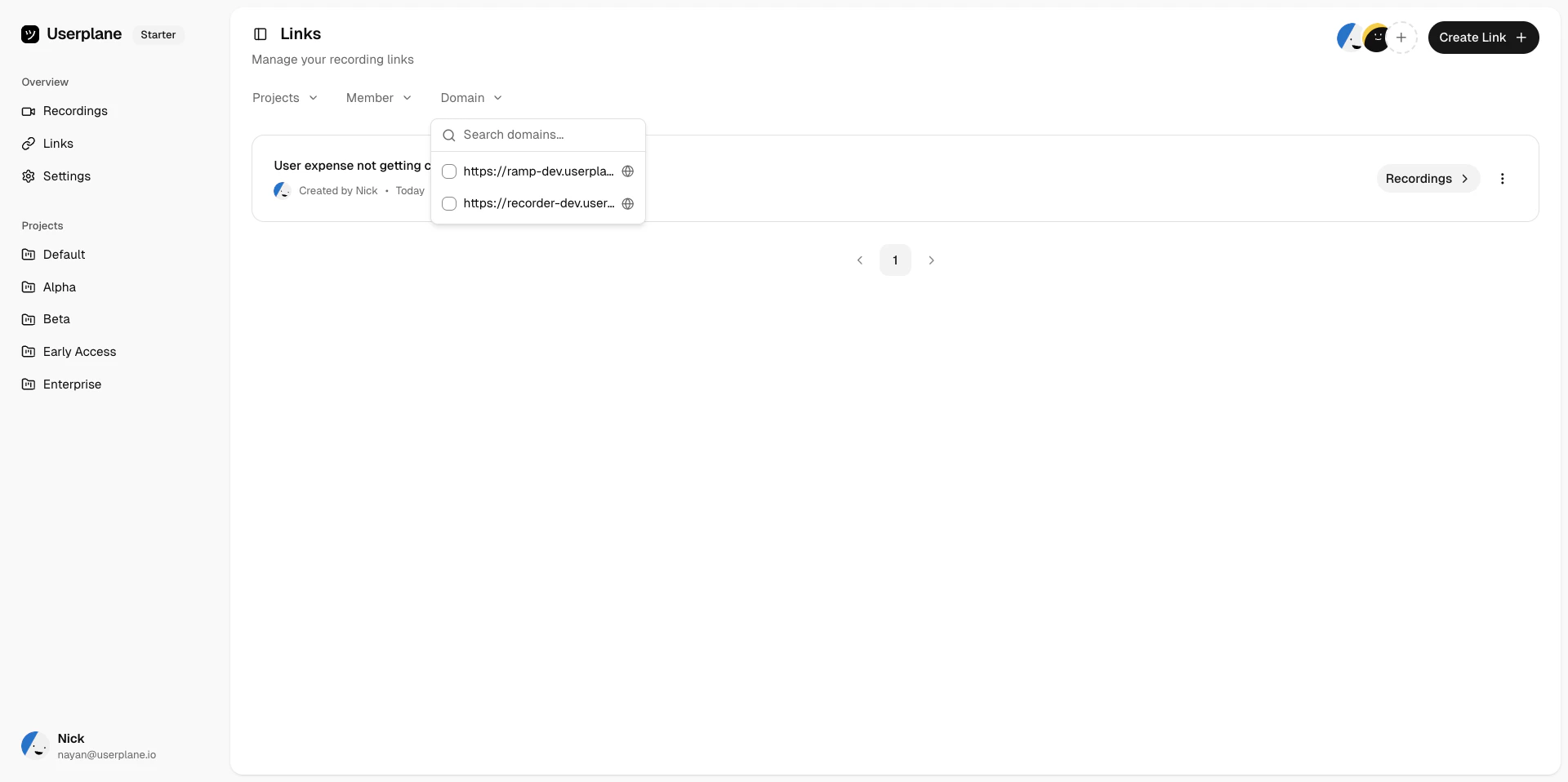 Links are displayed in a paginated list. Each link shows its reference, project, domain, creation date, and whether it is reusable or one-time.