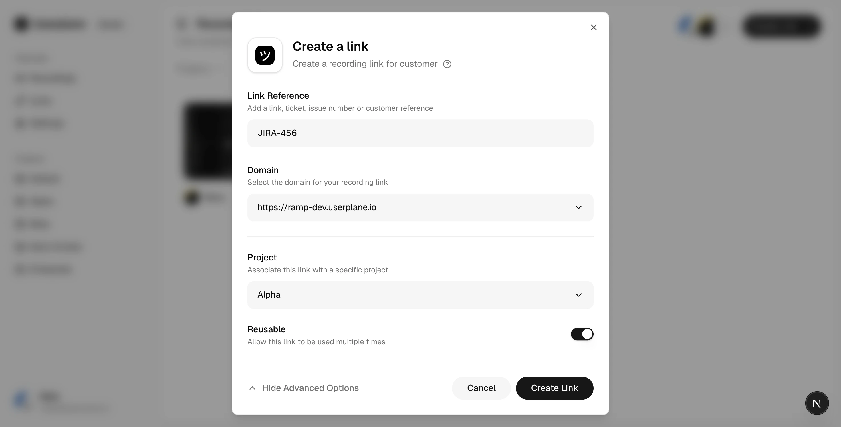 Reusable links work best when you want to collect recordings from multiple customers using the same entry point:- Help center articles — embed a reusable link in a troubleshooting guide so any customer reading that article can submit a recording.