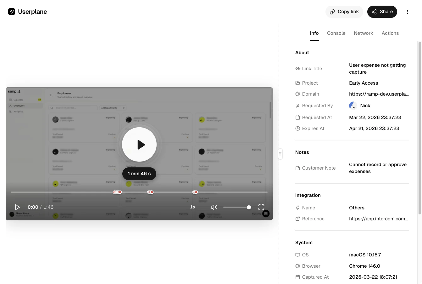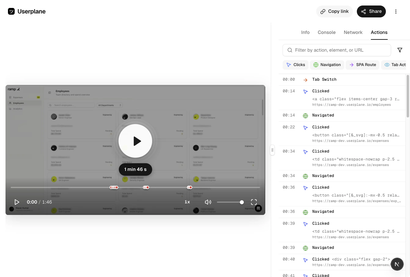 The Actions panel captures user interactions — clicks, text inputs, page navigations, and tab switches — with timestamps. Use it to reconstruct exactly what the customer did and in what order. Click any action to jump the video to that moment.- Recording details
