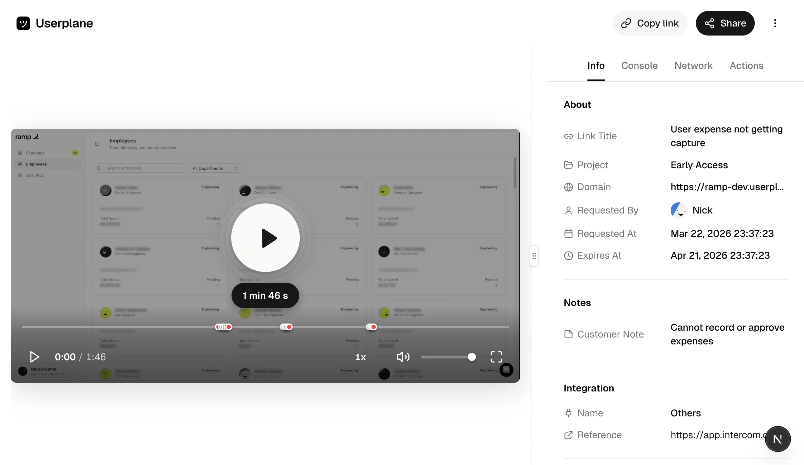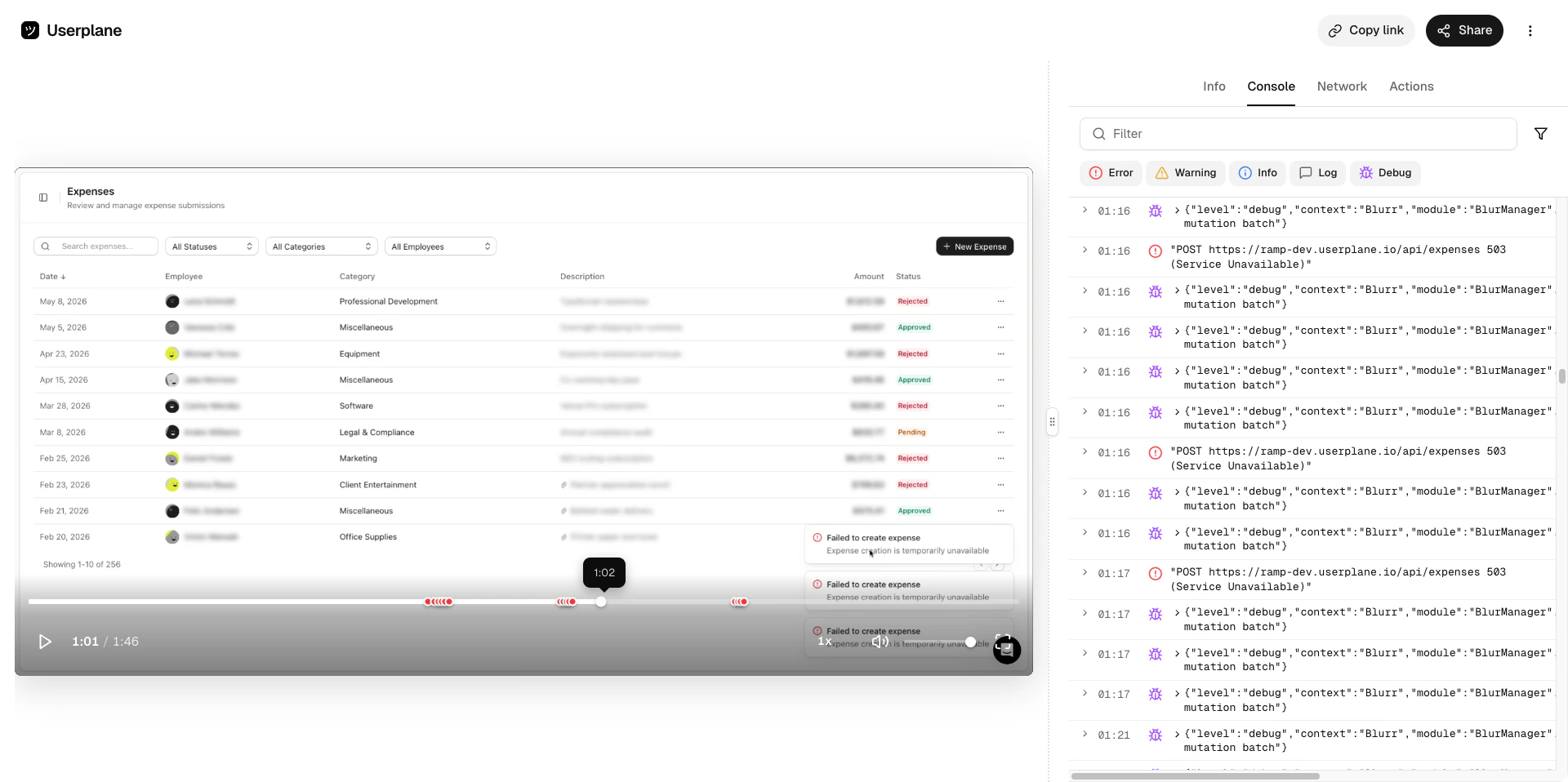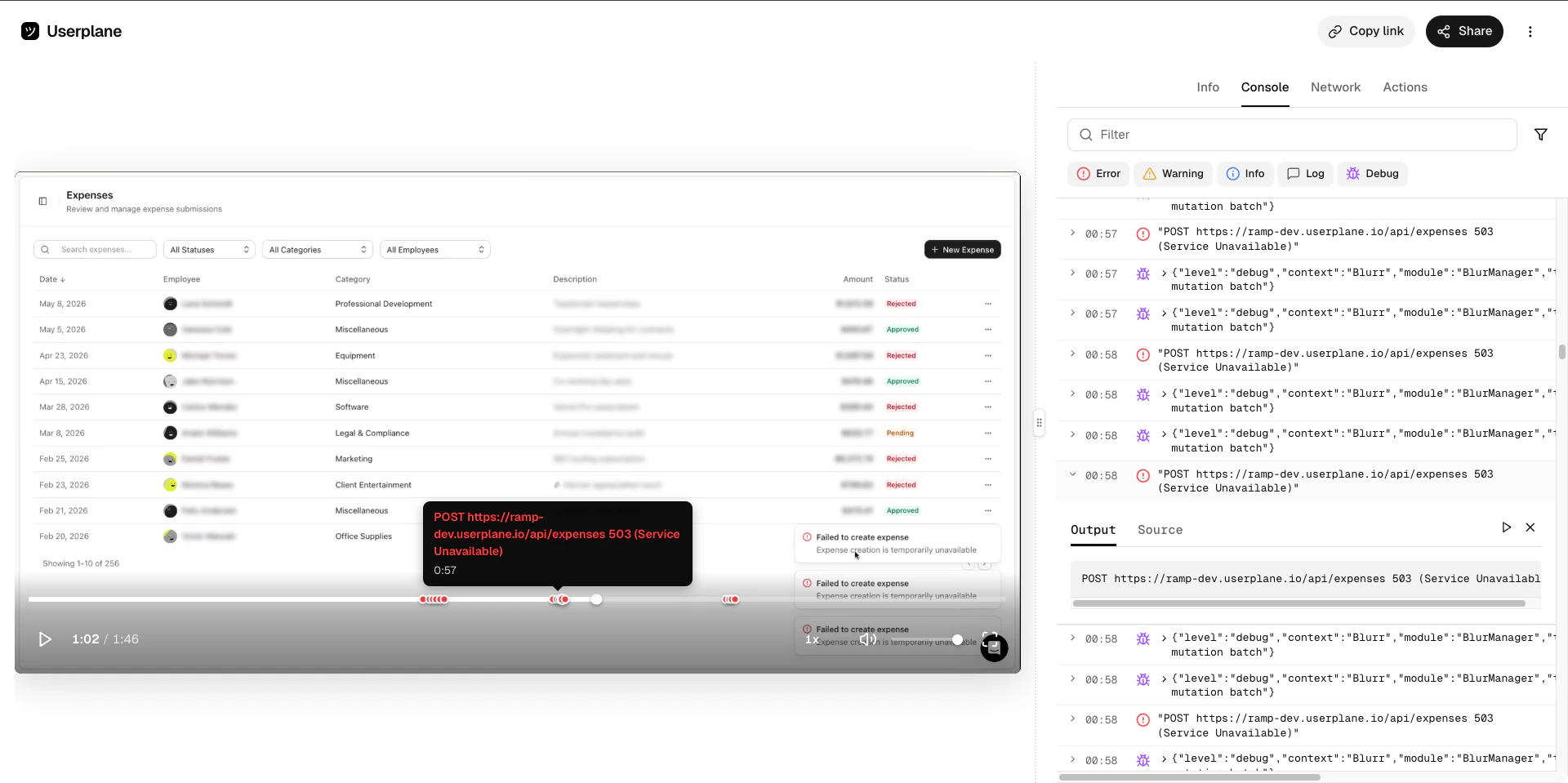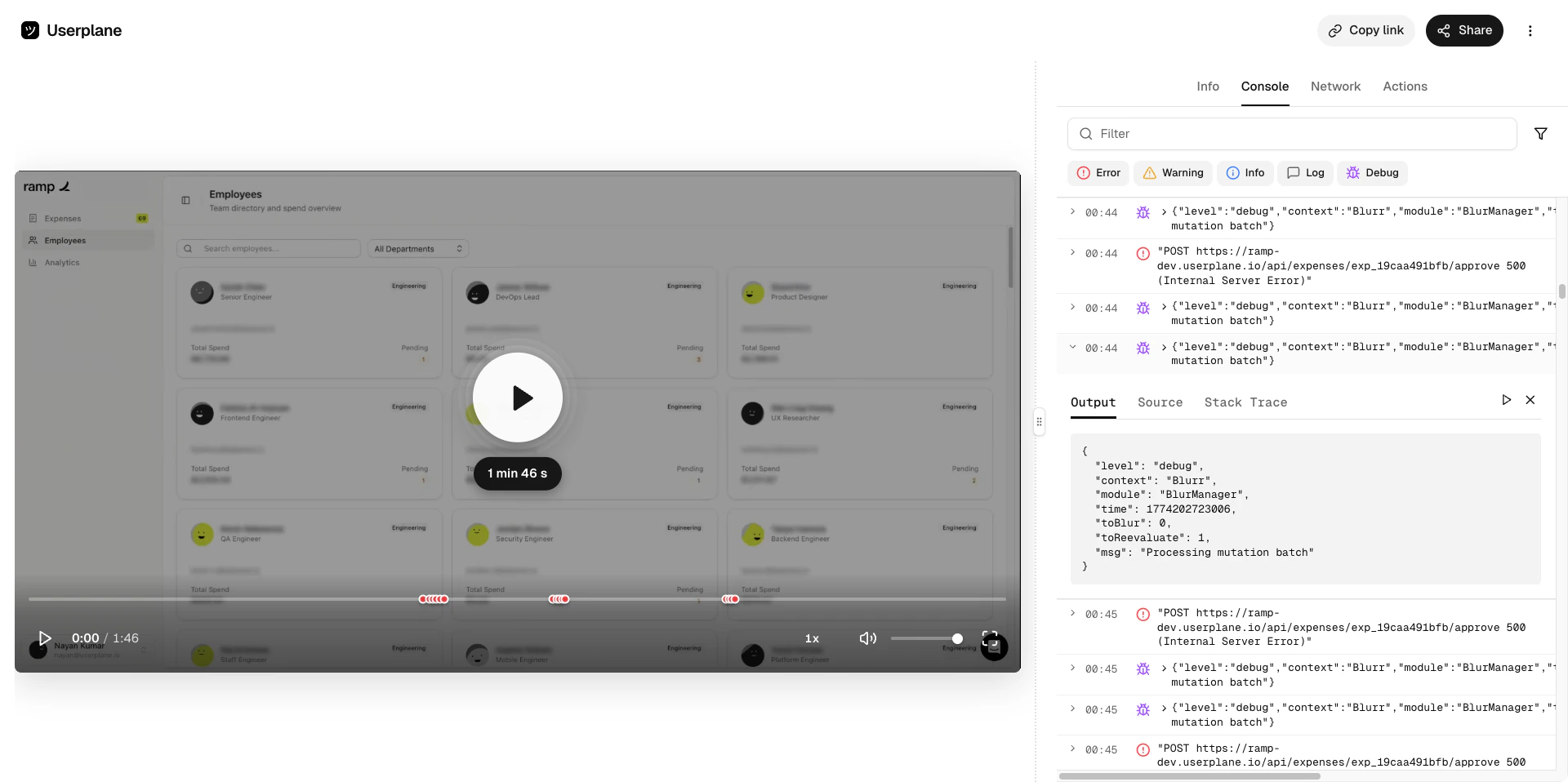 The Console panel captures browser console output — errors, warnings, info, and debug messages — exactly as they appeared in the customer’s browser. Each entry includes the log level, message, source file location, and a full stack trace when available. Click any entry to expand it and see the output, source, and stack trace. Clicking an entry also jumps the video to the moment the log was emitted.- Recording details