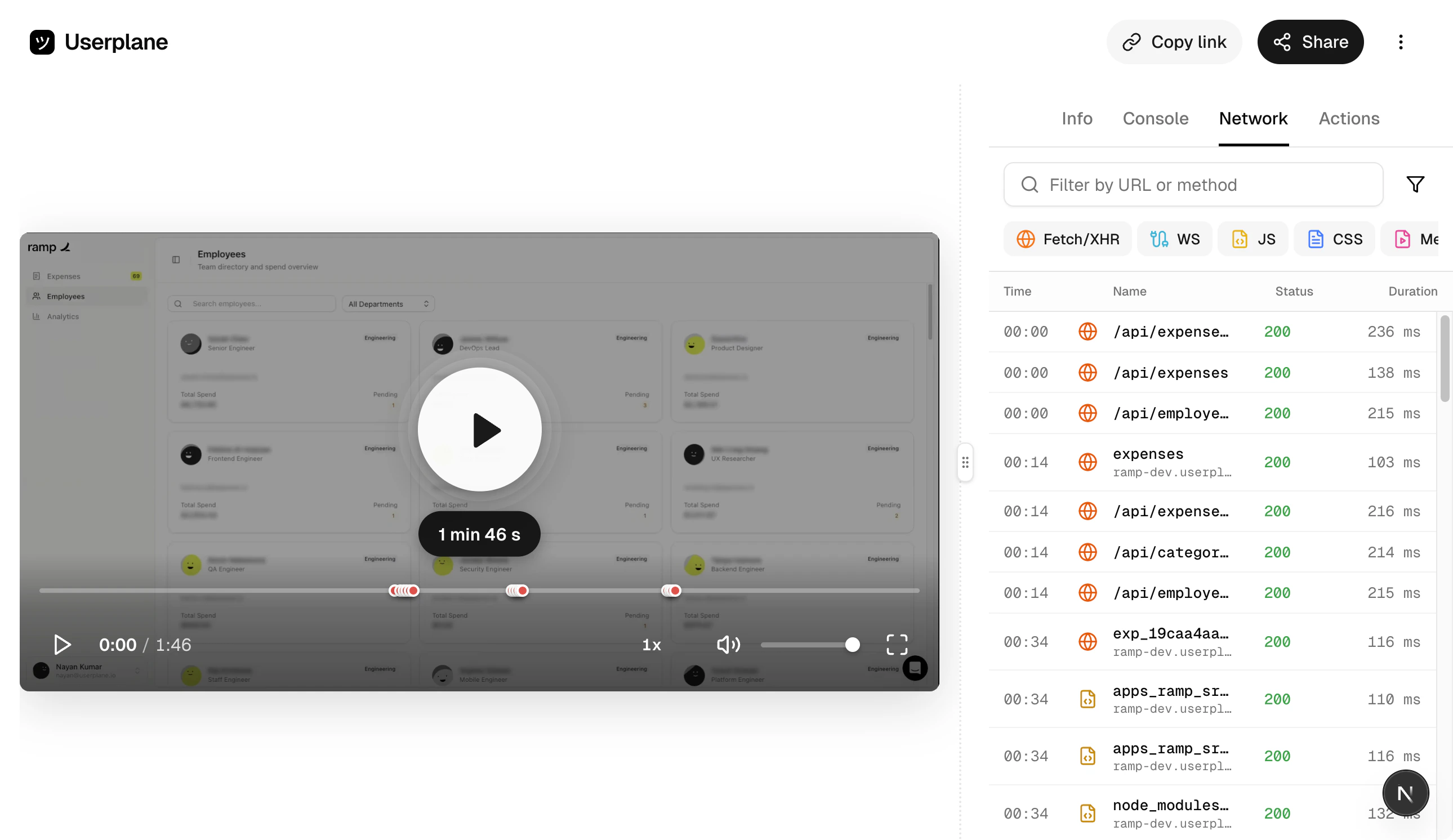 The Network panel captures HTTP requests made during the recording — method, URL, status code, timing, headers, and request/response payloads. Use it to identify failed API calls, slow responses, or unexpected payloads. The list view shows all requests chronologically. Click any request to open the detail view with full headers and body content.- Recording details