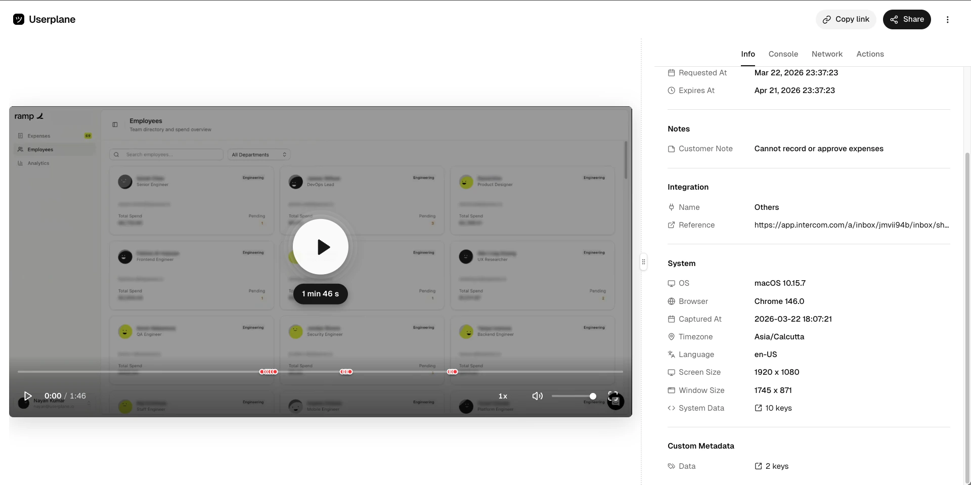 The Info panel shows everything about the recording that isn’t session data — who requested it, which project and domain it belongs to, any notes the customer added, and both system and custom metadata. Custom metadata is set via the Metadata SDK and can include user IDs, account names, feature flags, or any key-value pairs your app attaches to the session.- Recording details