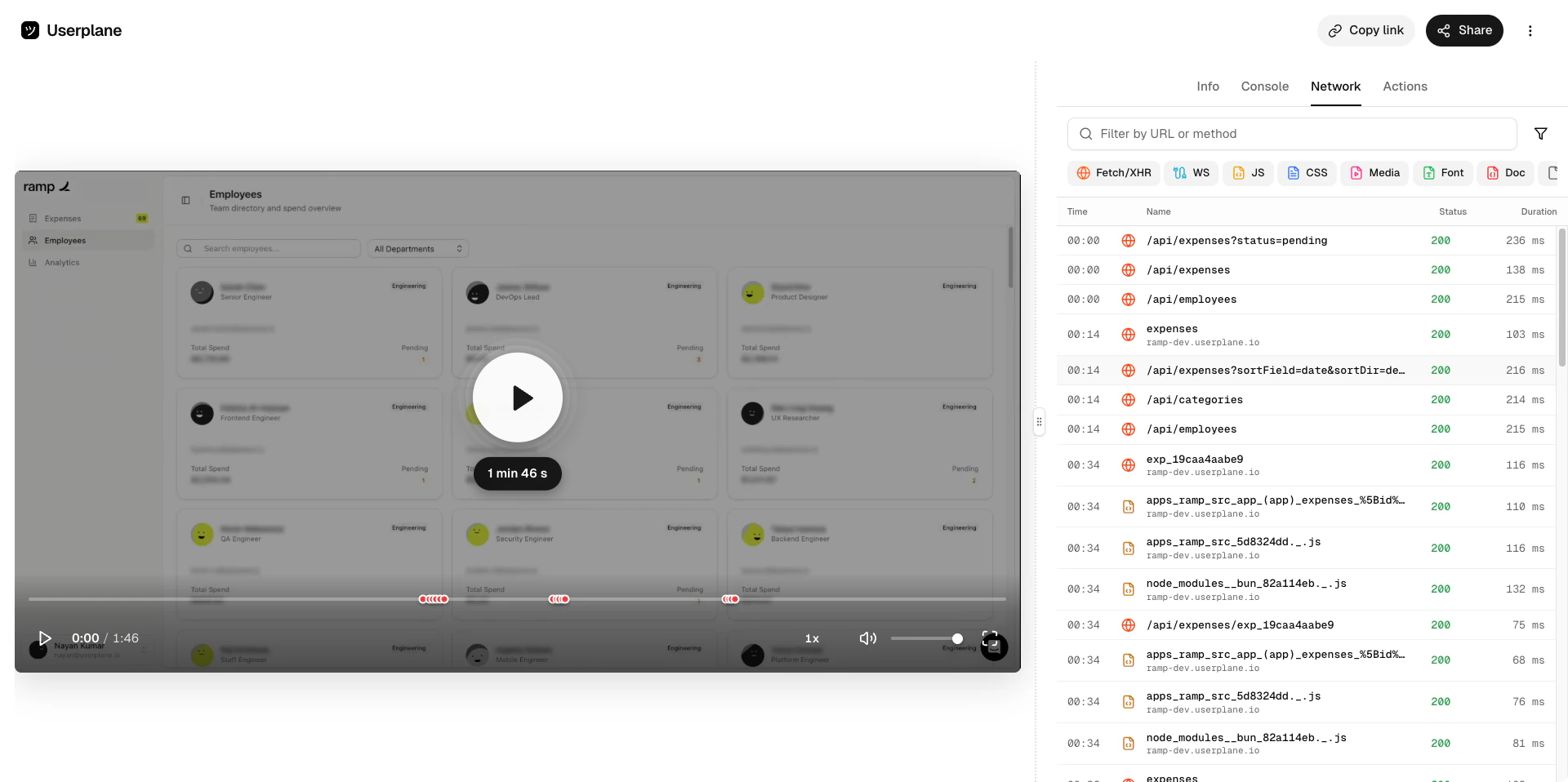 The video player supports standard playback controls — play, pause, scrub, and speed adjustment. Recordings are captured using the best codec available in the customer’s browser (AV1, VP9, H.264, or VP8). When voice and device audio was captured, audio plays back in sync with the video. As you watch, the right panel highlights the data entries that correspond to the current playback position — so you can see which console errors, network requests, or user actions occurred at any moment.