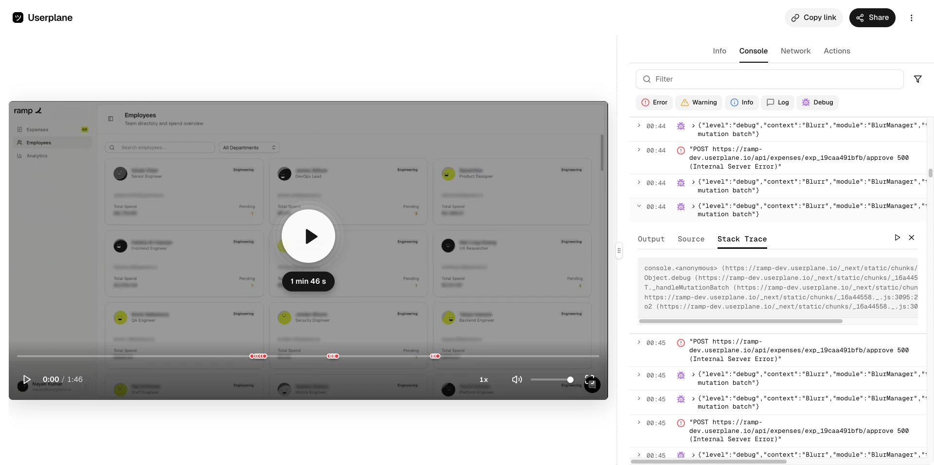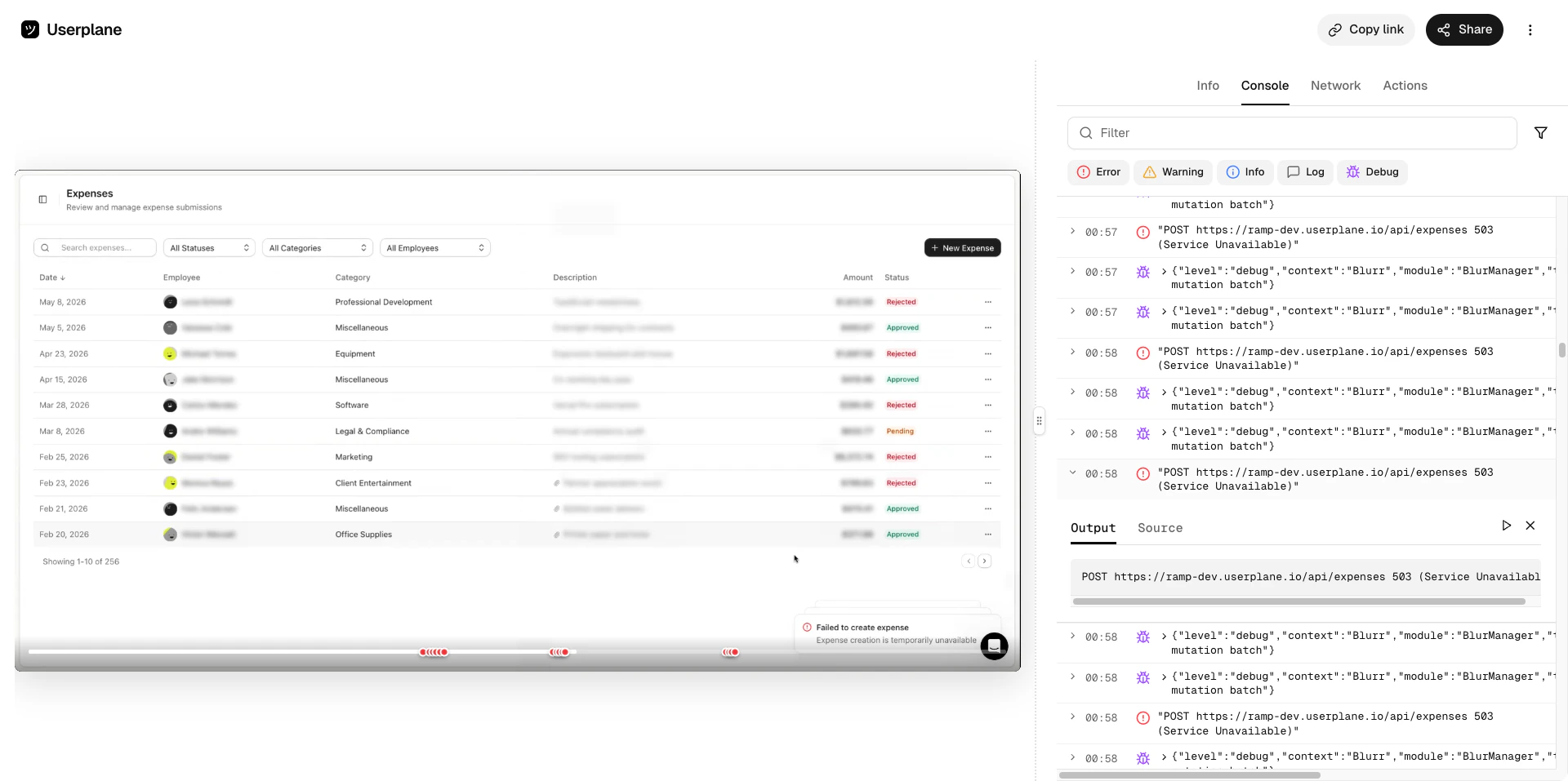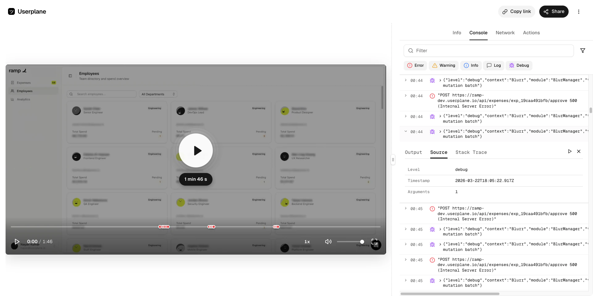 Inspect captured browser console logs — errors, warnings, and debug messages — with full output, source location, and stack traces.