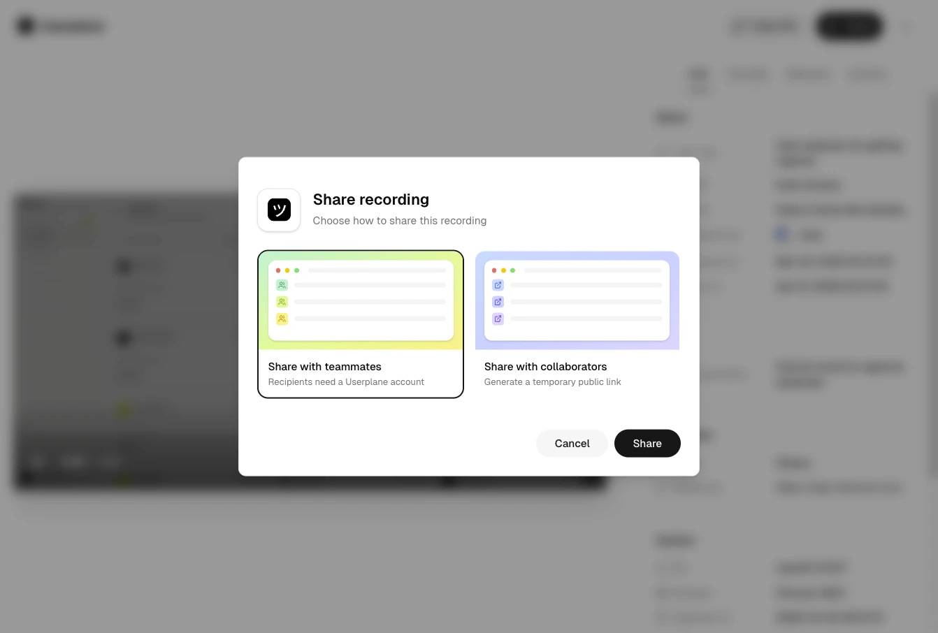 Userplane supports two ways to share a recording:| Mode | Who can view | Requires a Userplane account |